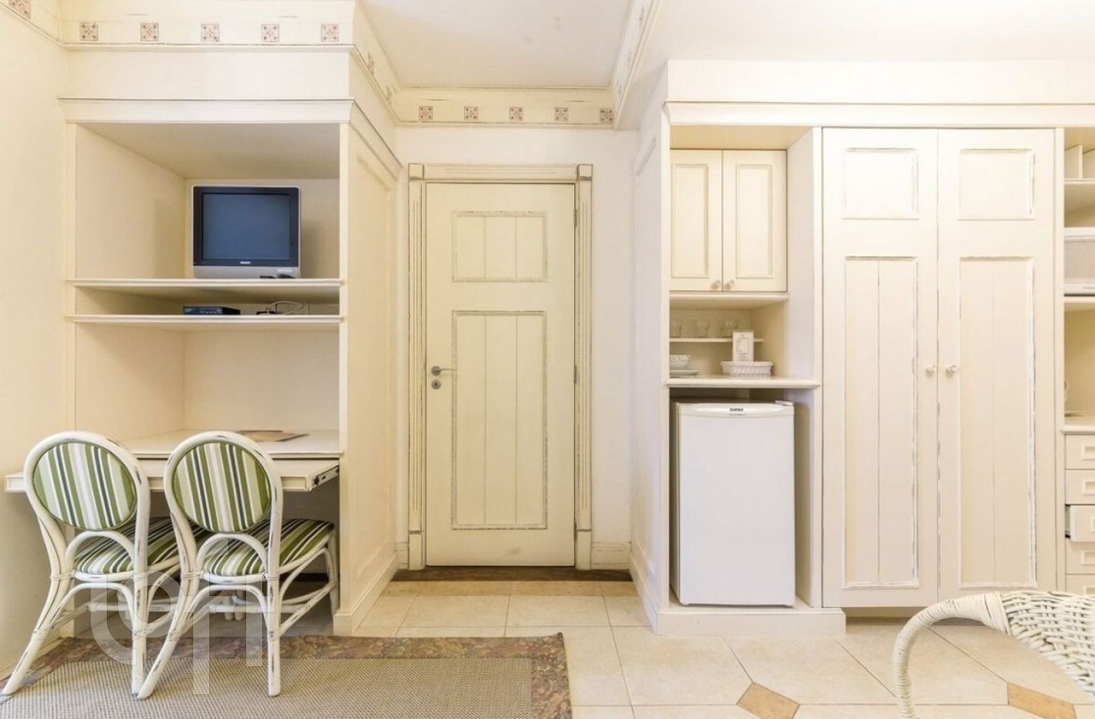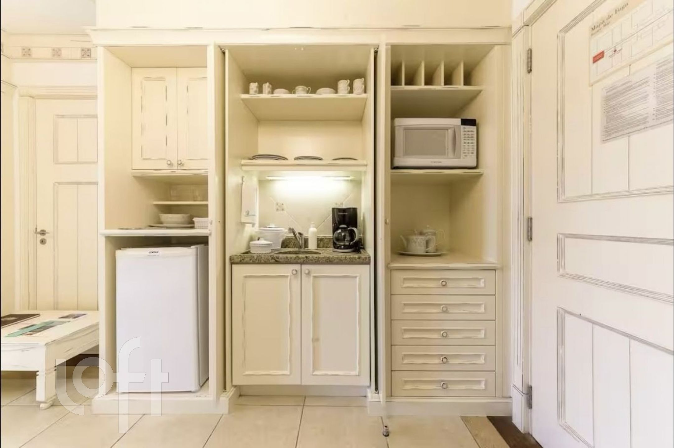 – Mini cozinha com micro-ondas, frigobar e utensílios