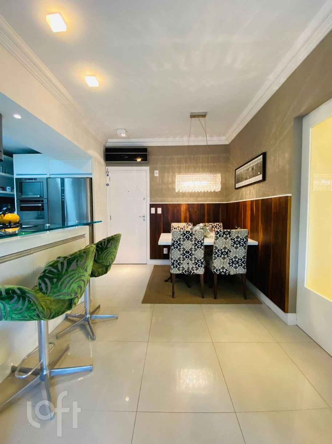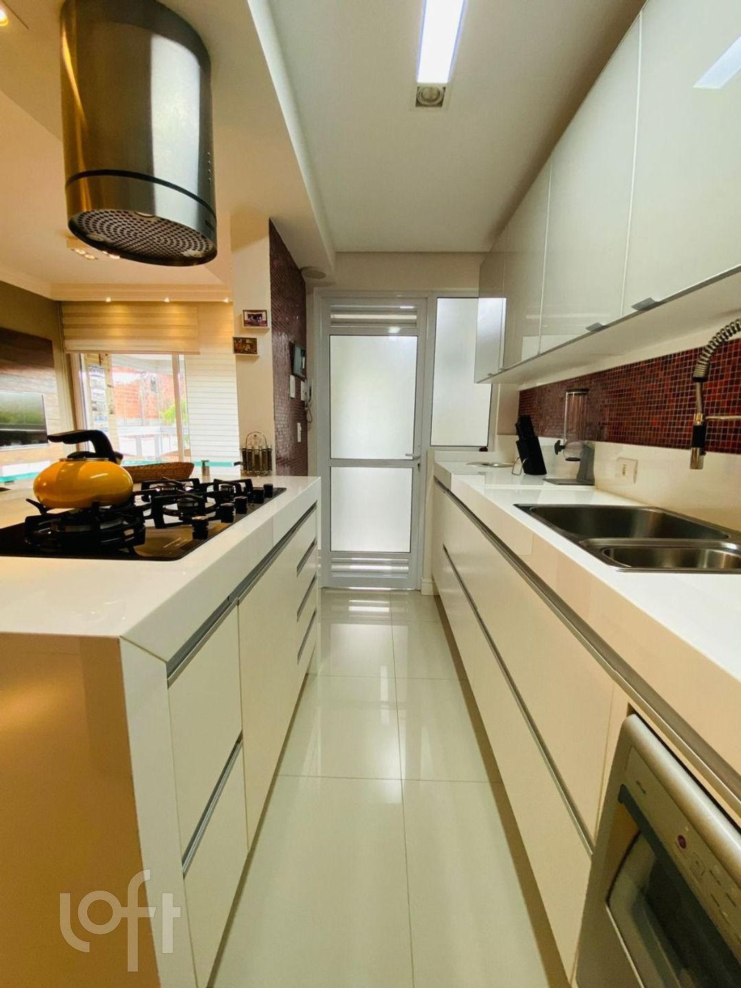 A cozinha, moderna e equipada, possui uma ilha central com bancada, facilitando o preparo de refeições e tornando o ambiente ainda mais convidativo. Ela também oferece acesso direto à área de serviço e à sacada, que é fechada com vidro Reiki e conta com um charmoso deck de madeira, criando um ambiente perfeito para relaxar ao final do dia.