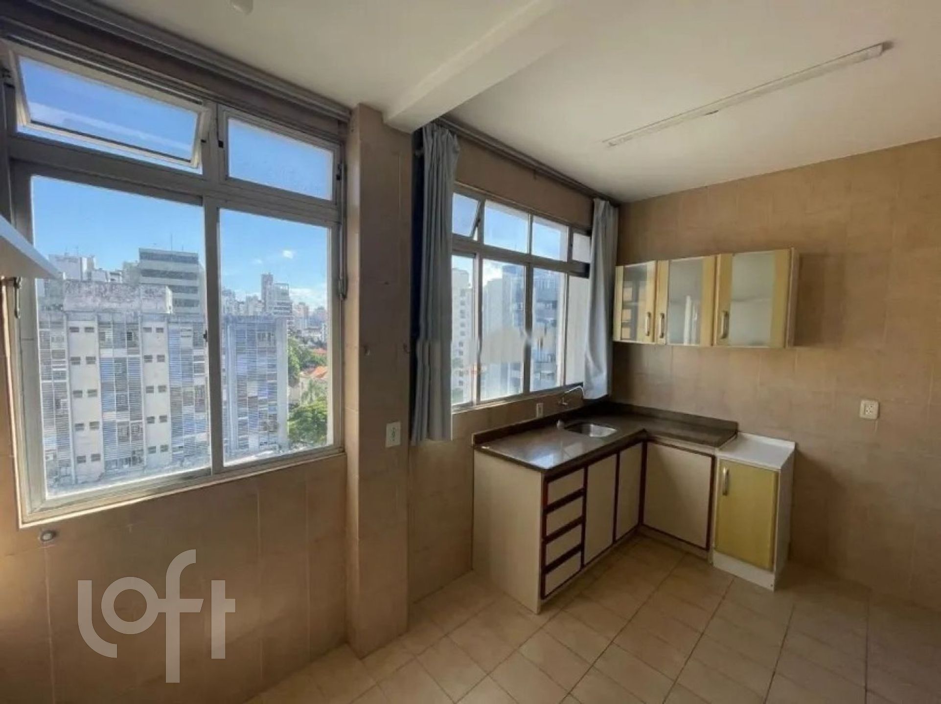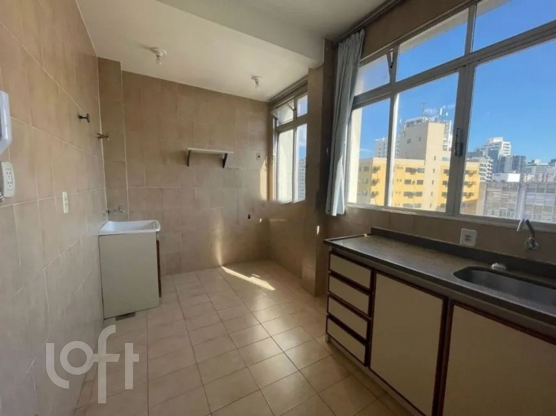 Apartamento com 2 quartos, sacada, sala, cozinha ampla, área de serviço, banheiro com ventilação natural.