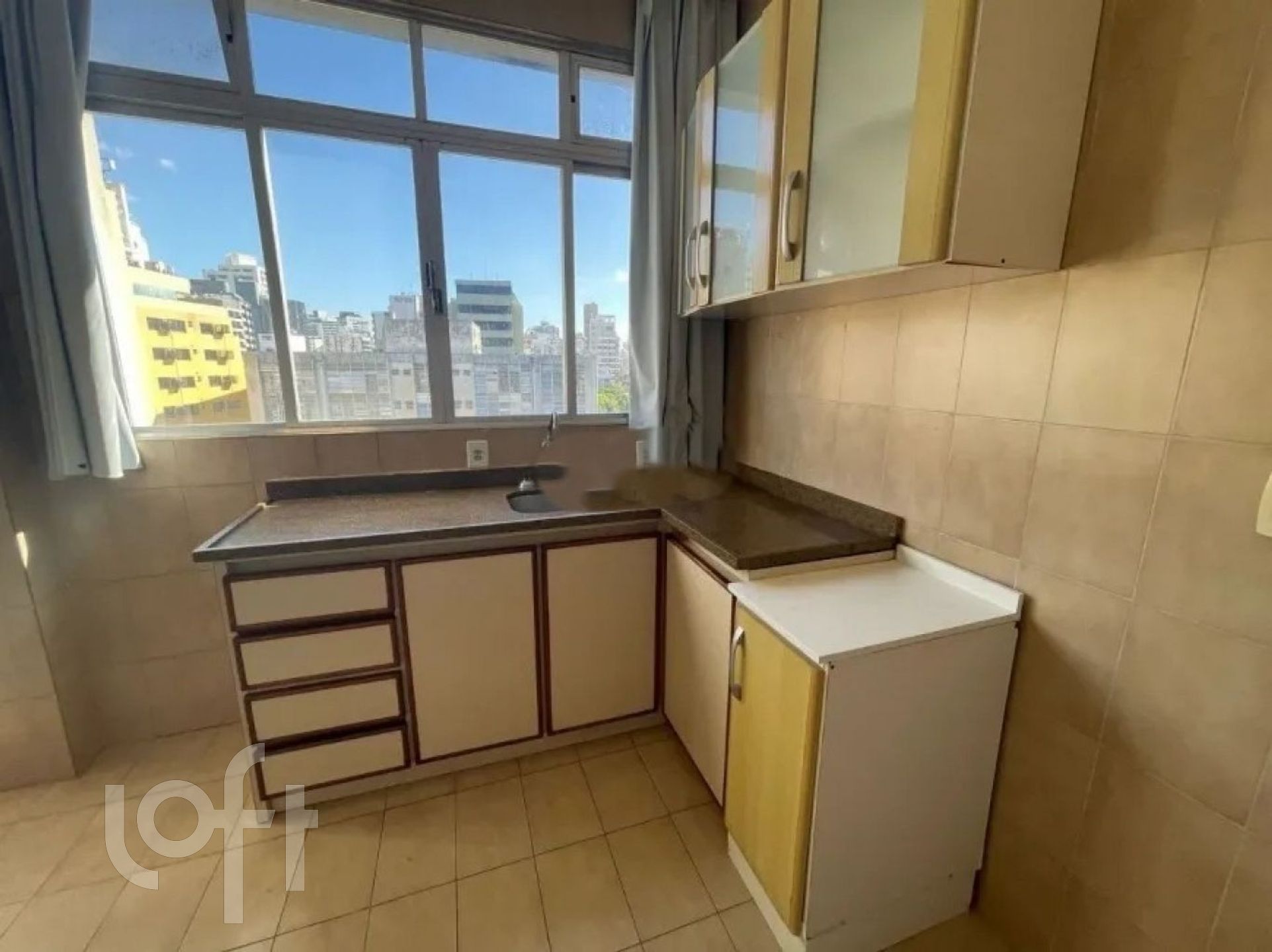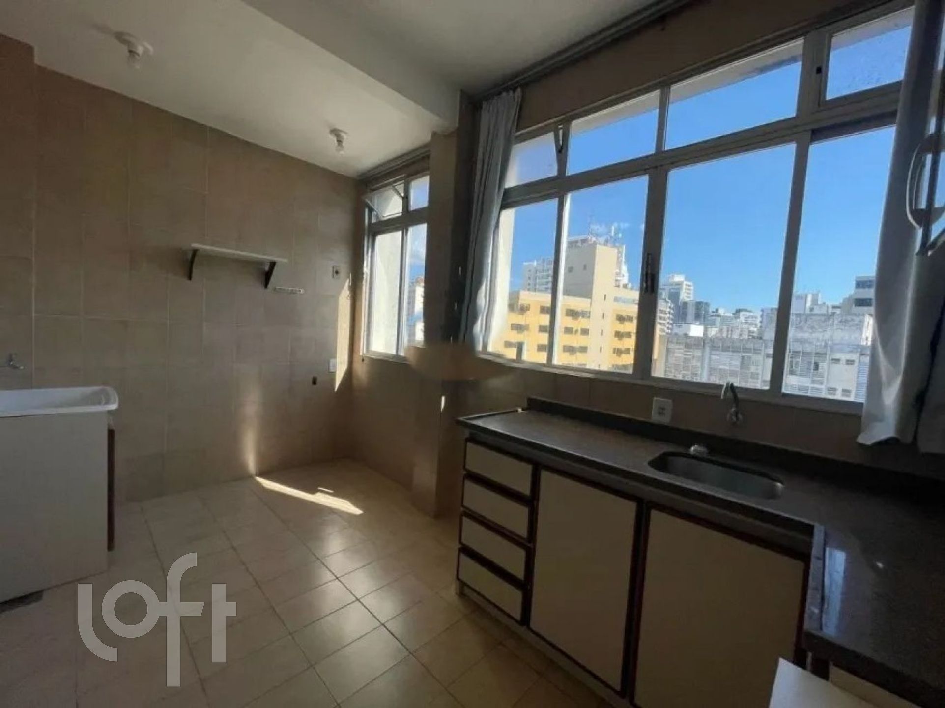 Apartamento com 2 quartos, sacada, sala, cozinha ampla, área de serviço, banheiro com ventilação natural.