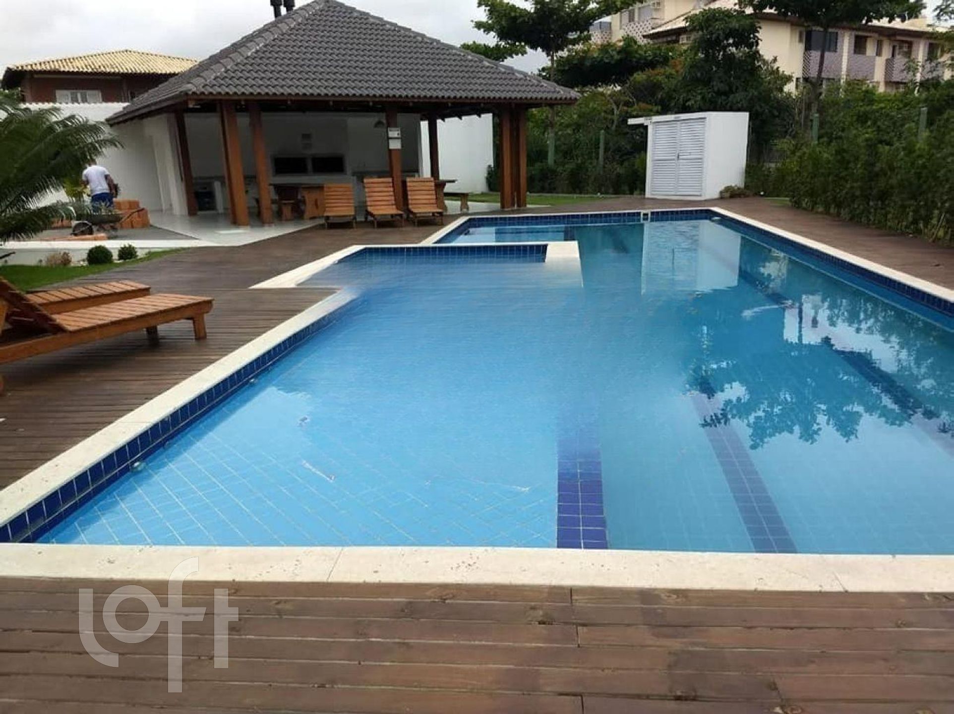 Fica mobília fixa: roupeiros, armários de cozinha, fogão embutido, área de serviço (armários e tanque), bancadas e ar na suíte