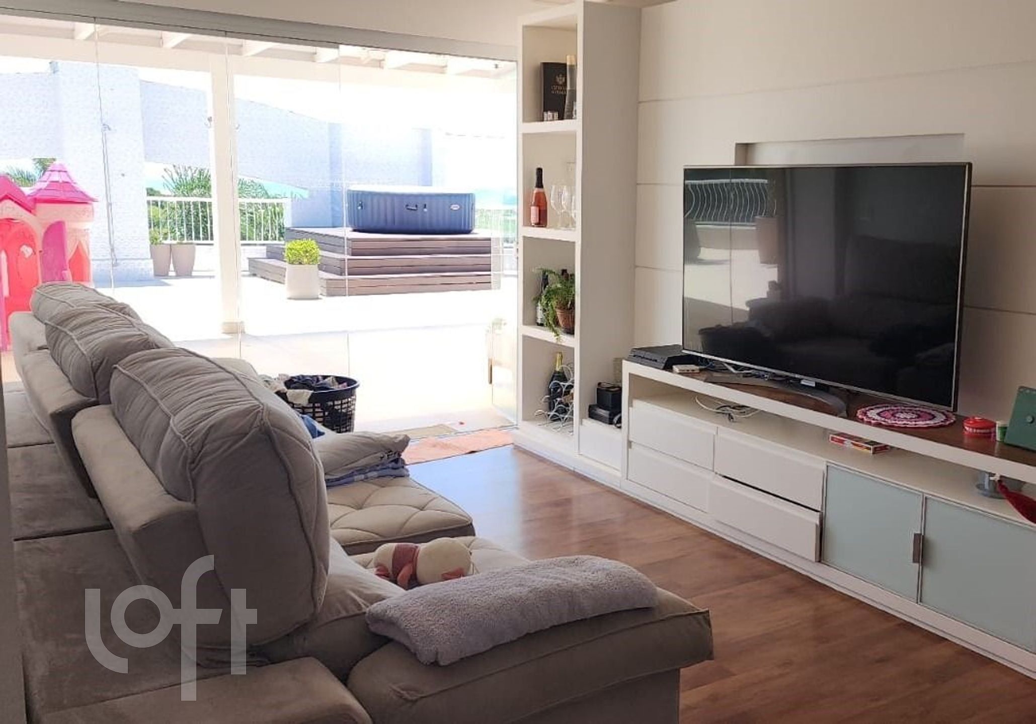Imóvel semimobiliado, com terraço amplo e ensolarado, contendo área coberta, mais churrasqueira e hidromassagem.