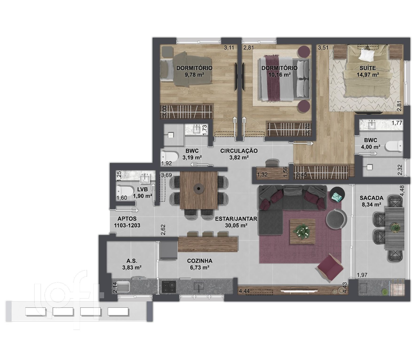 – Piso laminado de madeira nos dormitórios;