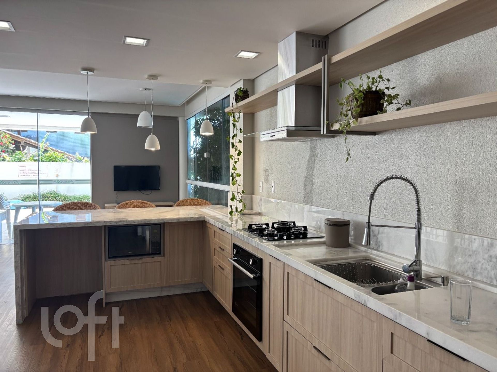Cozinha grande e bem planejada, ideal para quem ama cozinhar com vista para o mar.