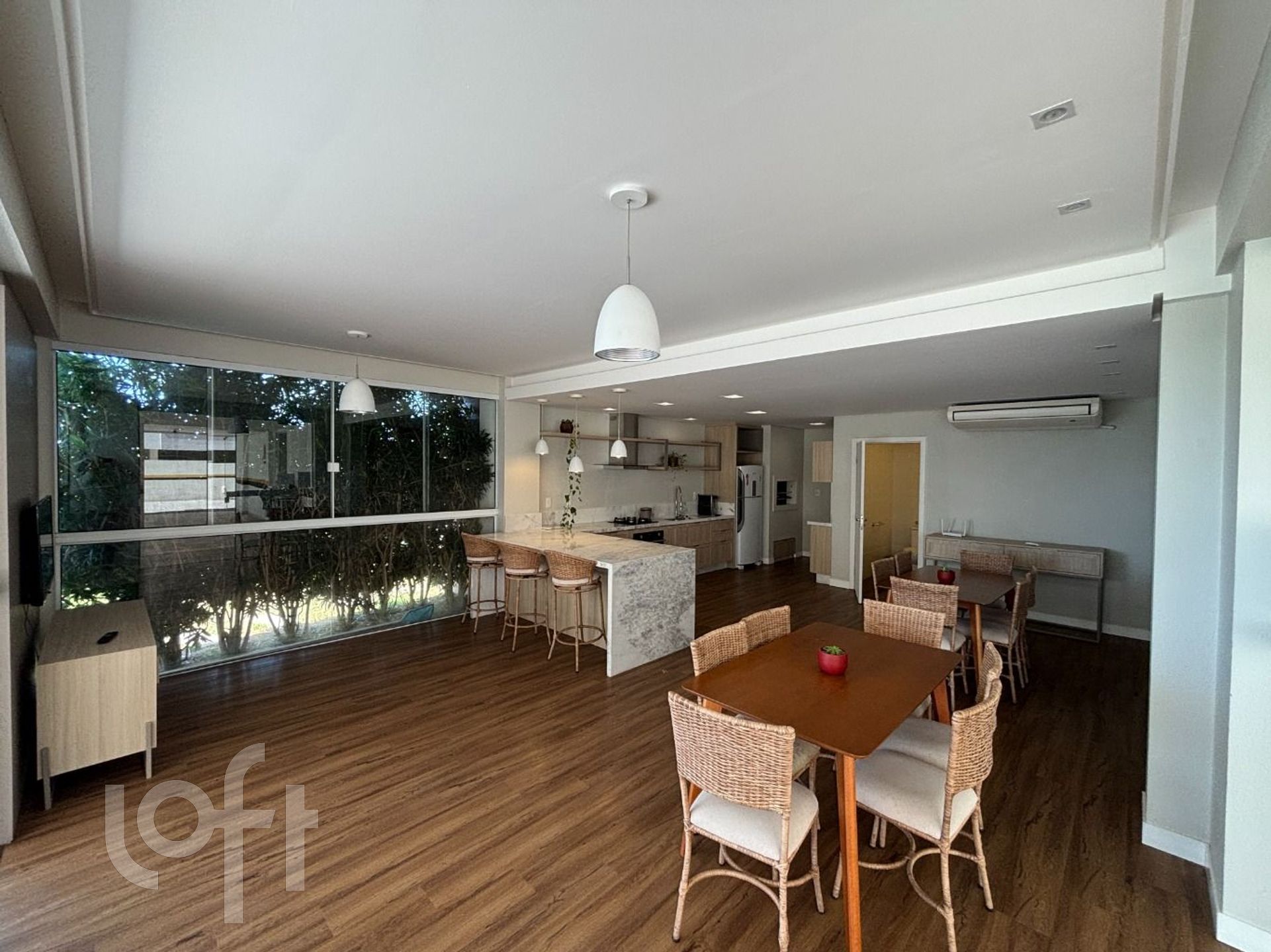 Sala de estar e jantar integradas, com ampla iluminação natural e o sol da manhã iluminando cada canto.