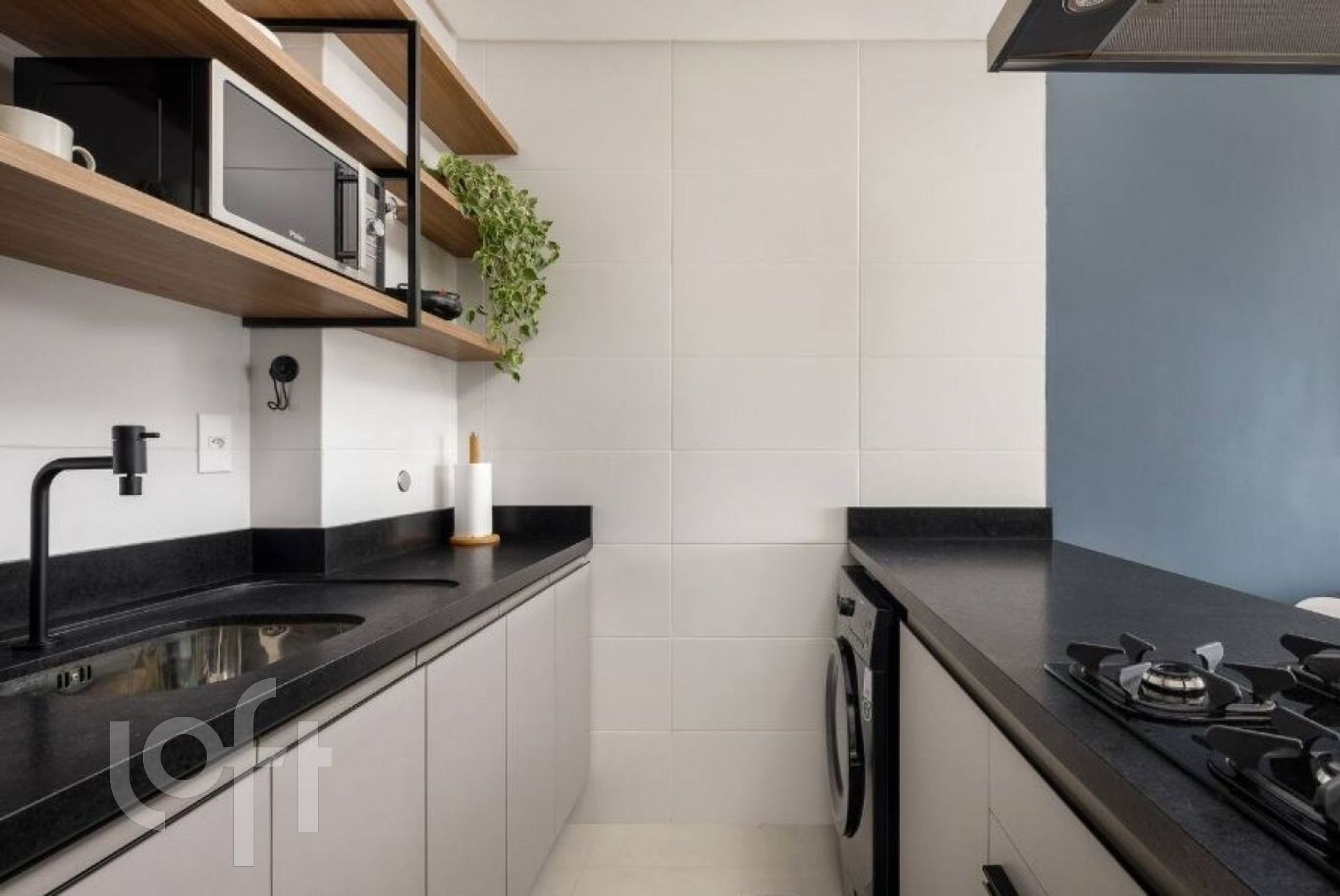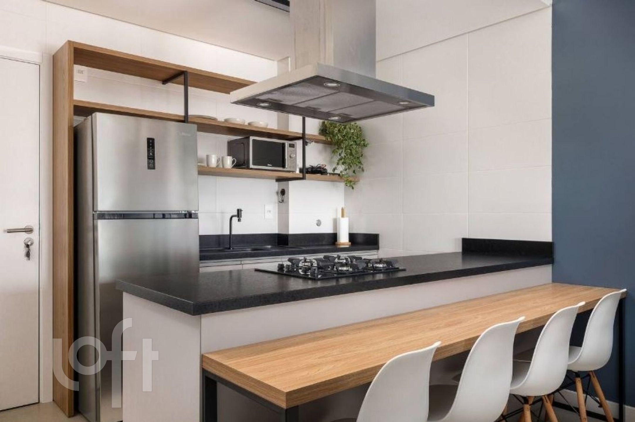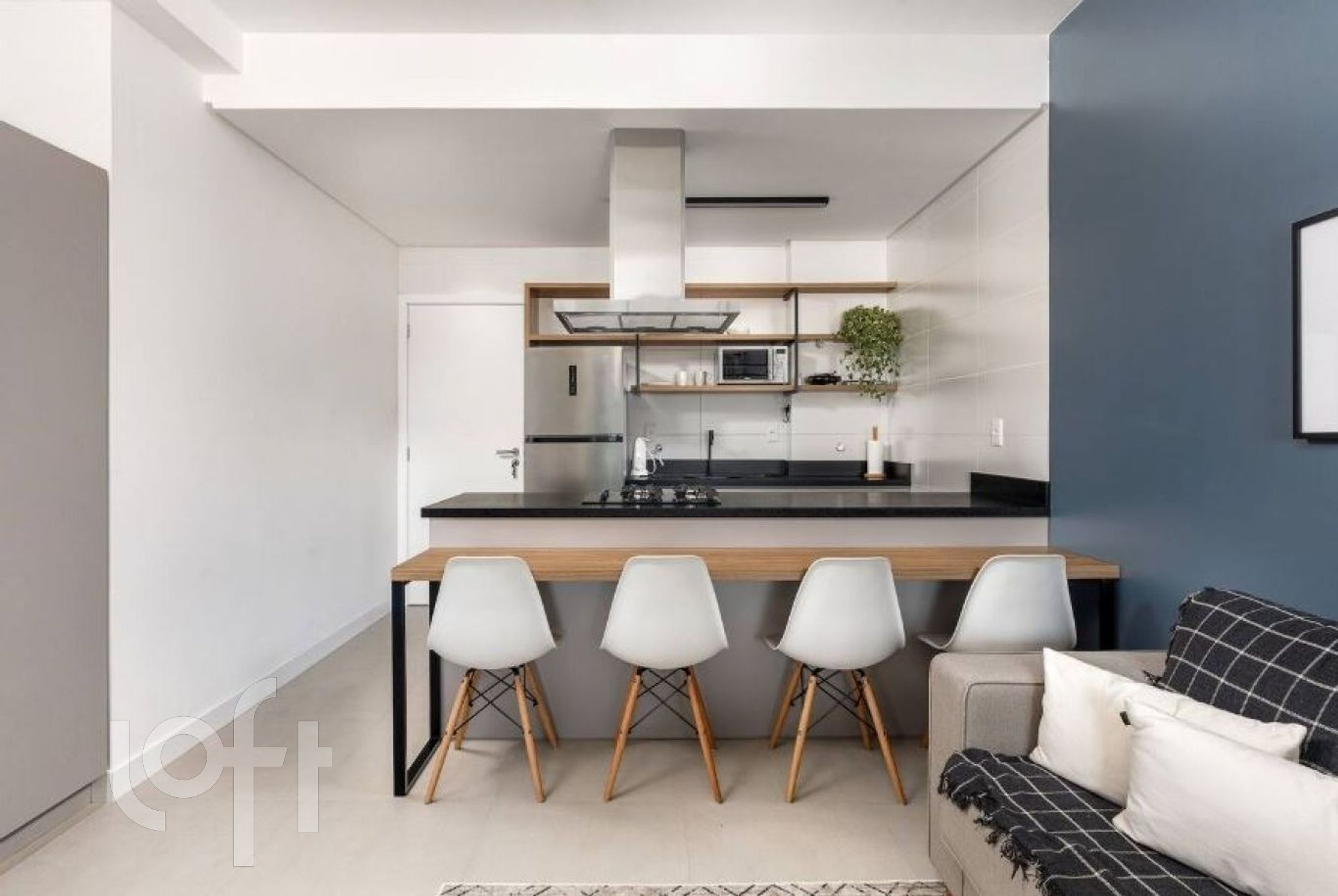 Cozinha em conjunto com uma sala de estar e um quarto. Conta com banheiro completo.