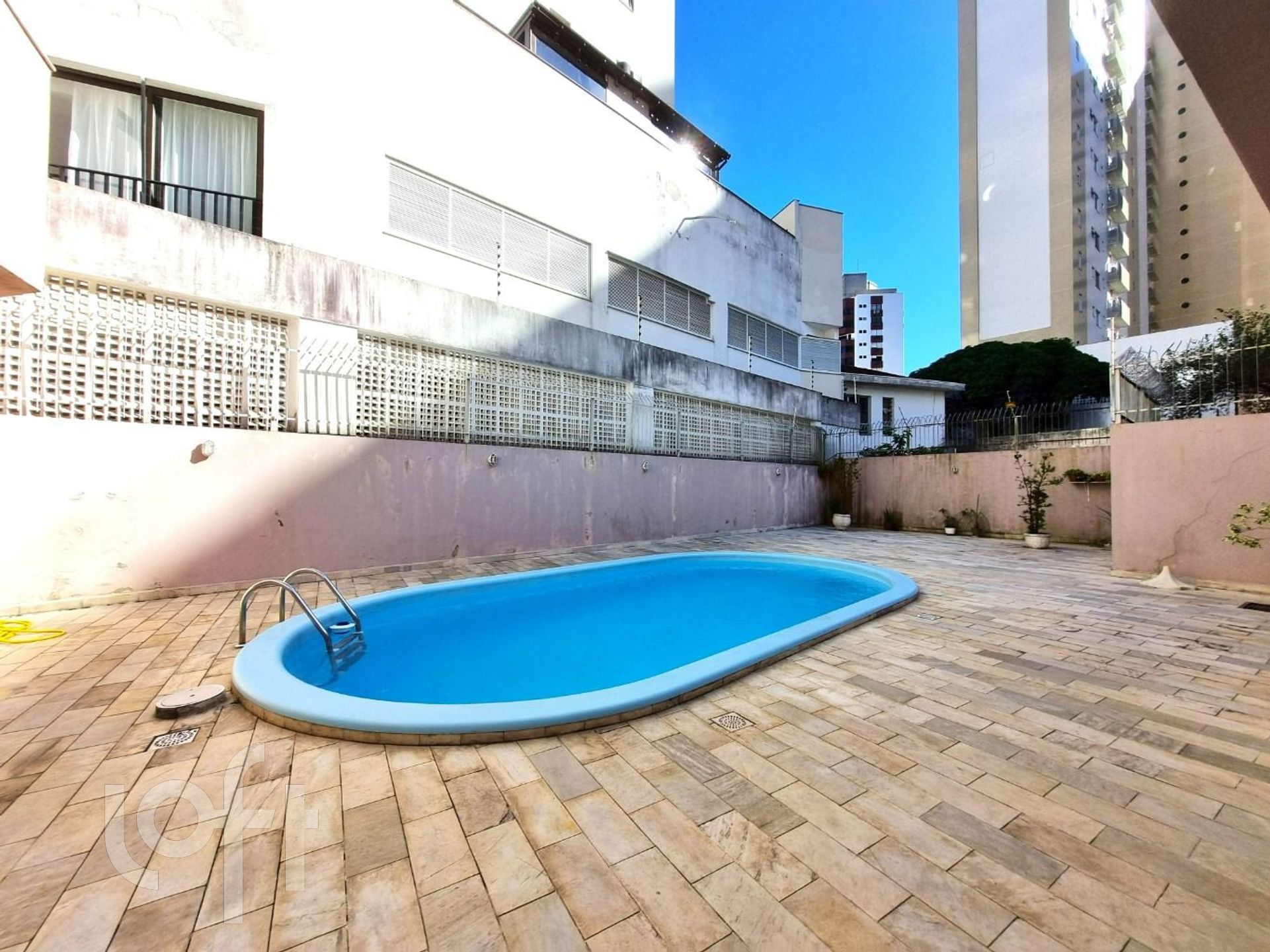 Condomínio com portaria remota, elevador, zeladoria, salão de festas e piscina.