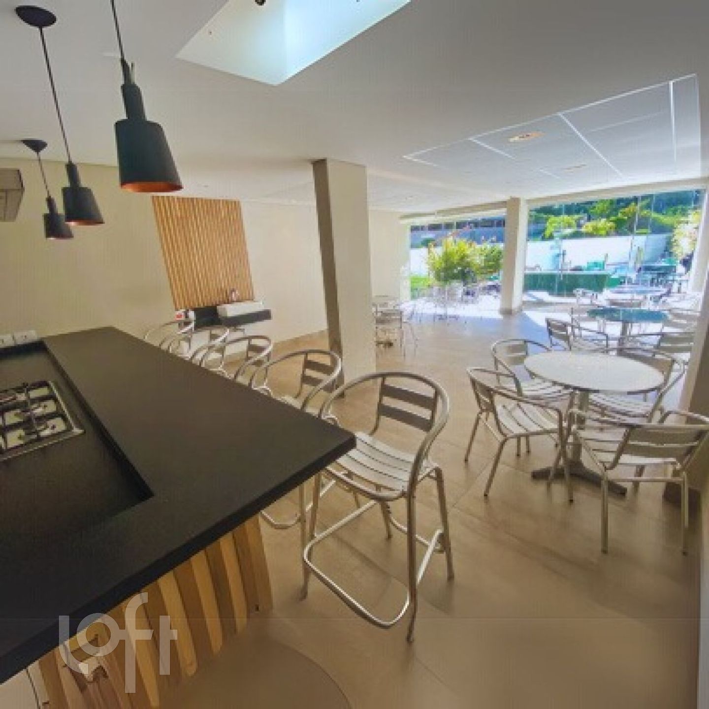 Condomínio com elevador, piscina e salão de festas.