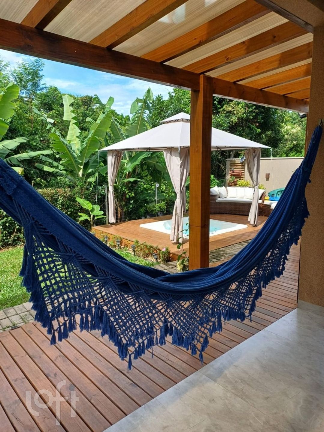 Área Social: Deck com churrasqueira, pia e bancada, banheira de hidromassagem, quintal com árvores frutíferas e canil.