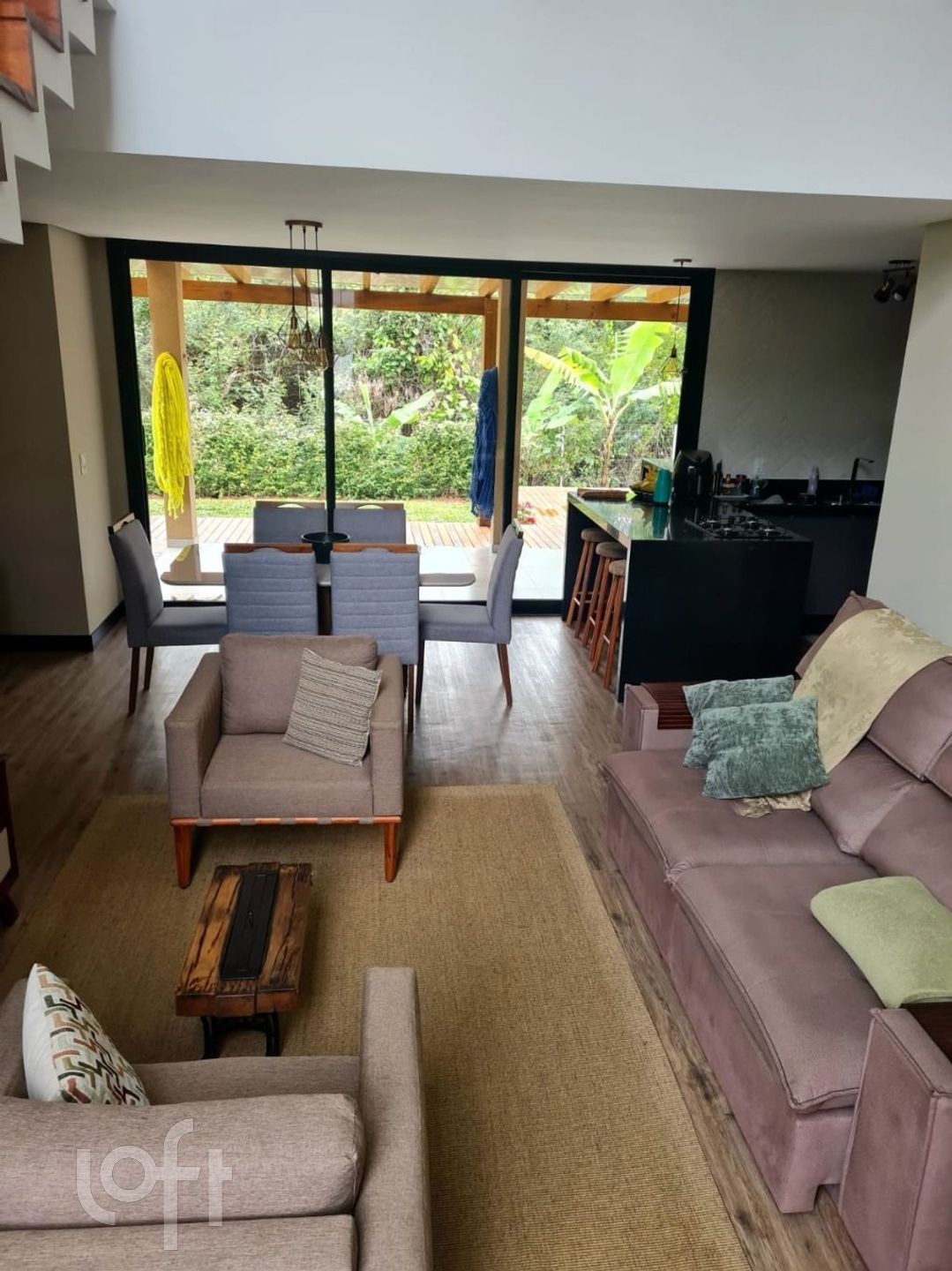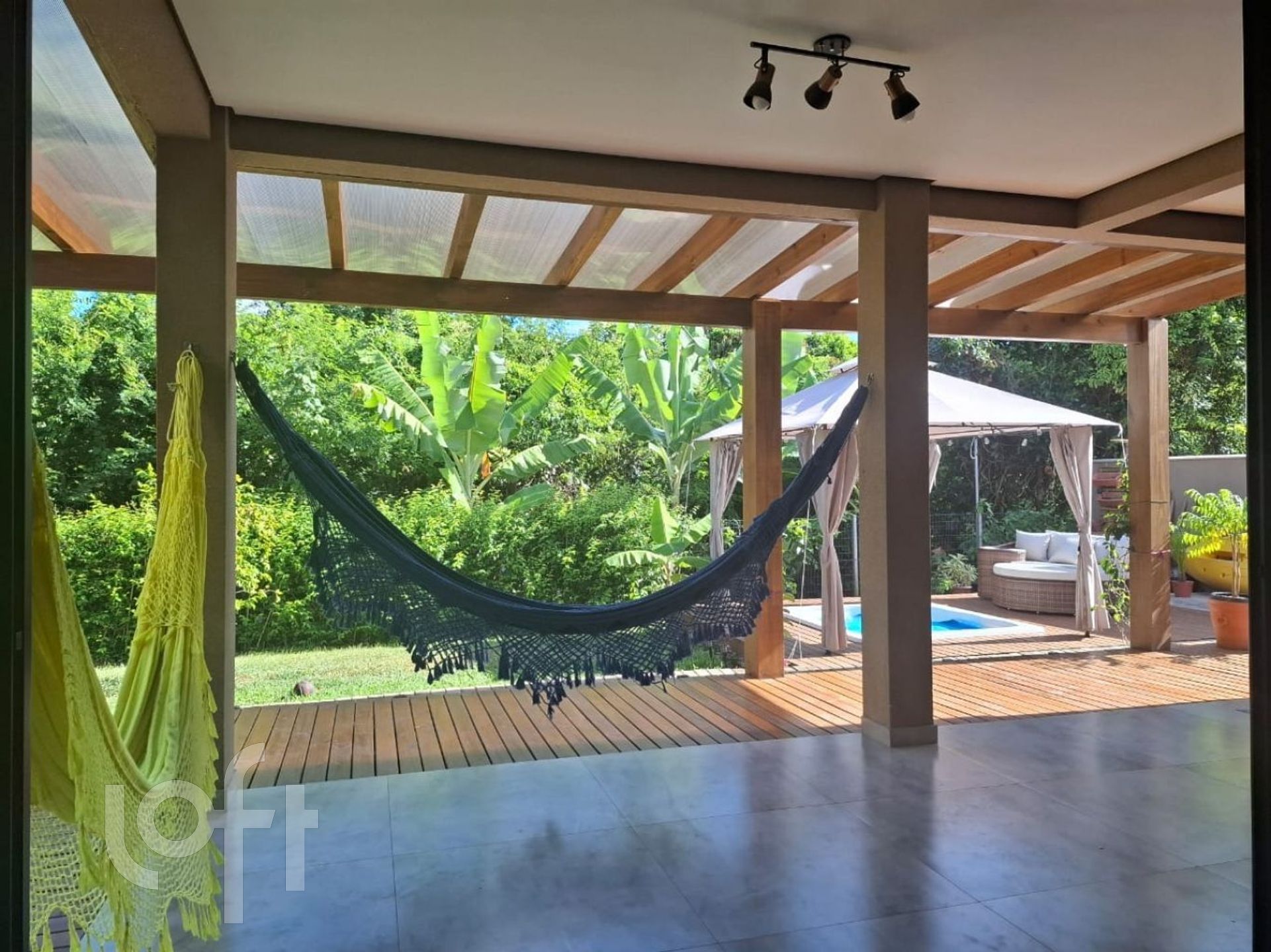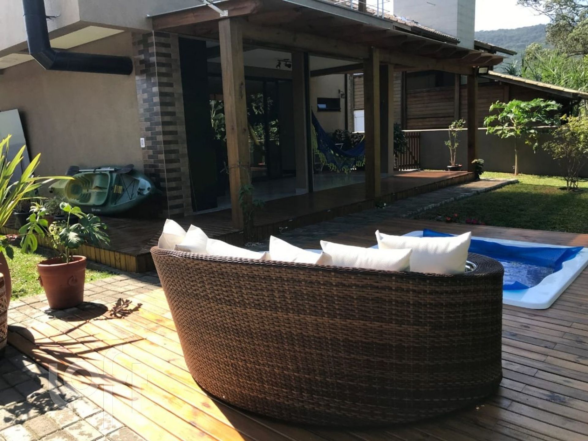 Área Social: Deck com churrasqueira, pia e bancada, banheira de hidromassagem, quintal com árvores frutíferas e canil.