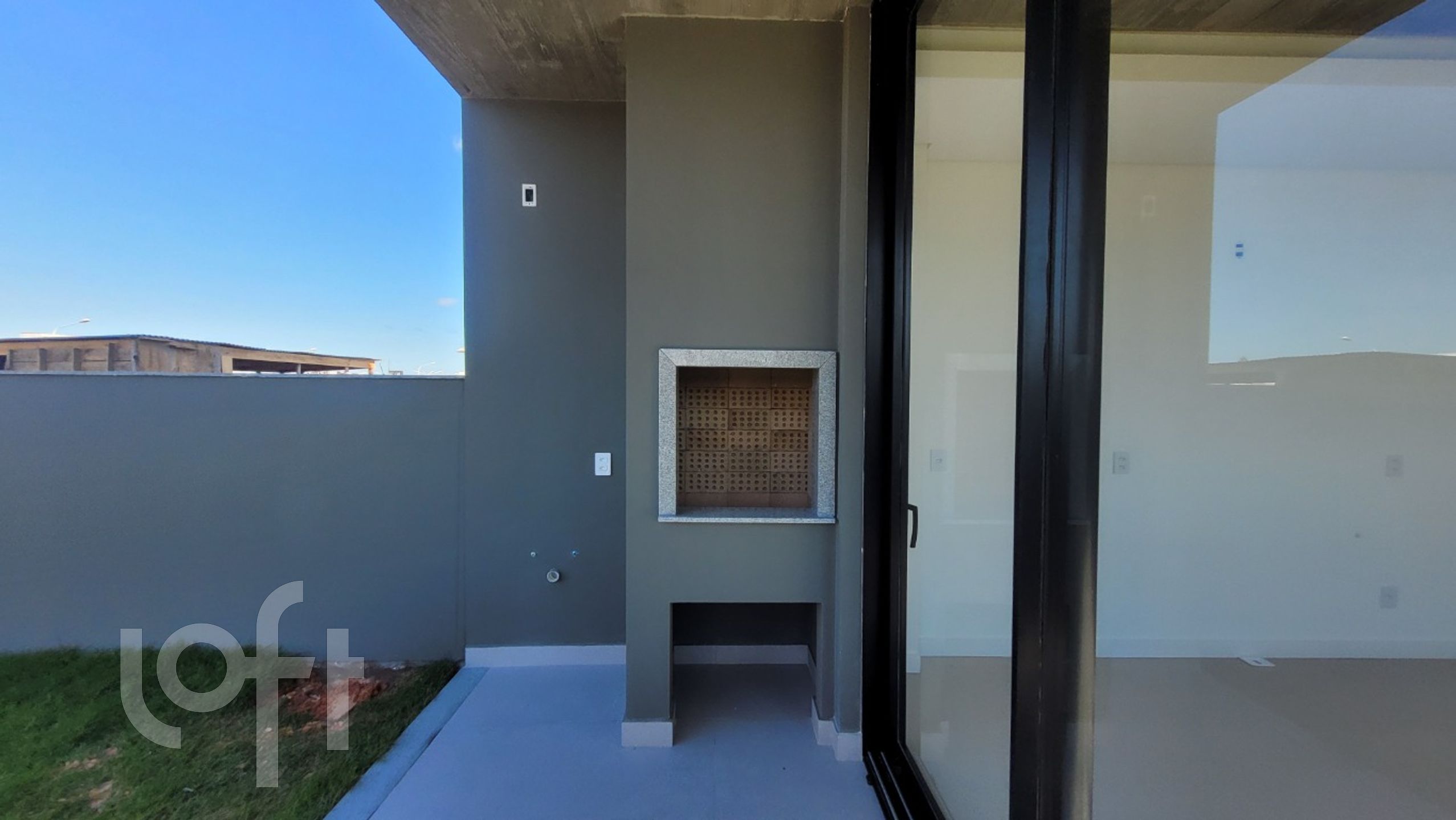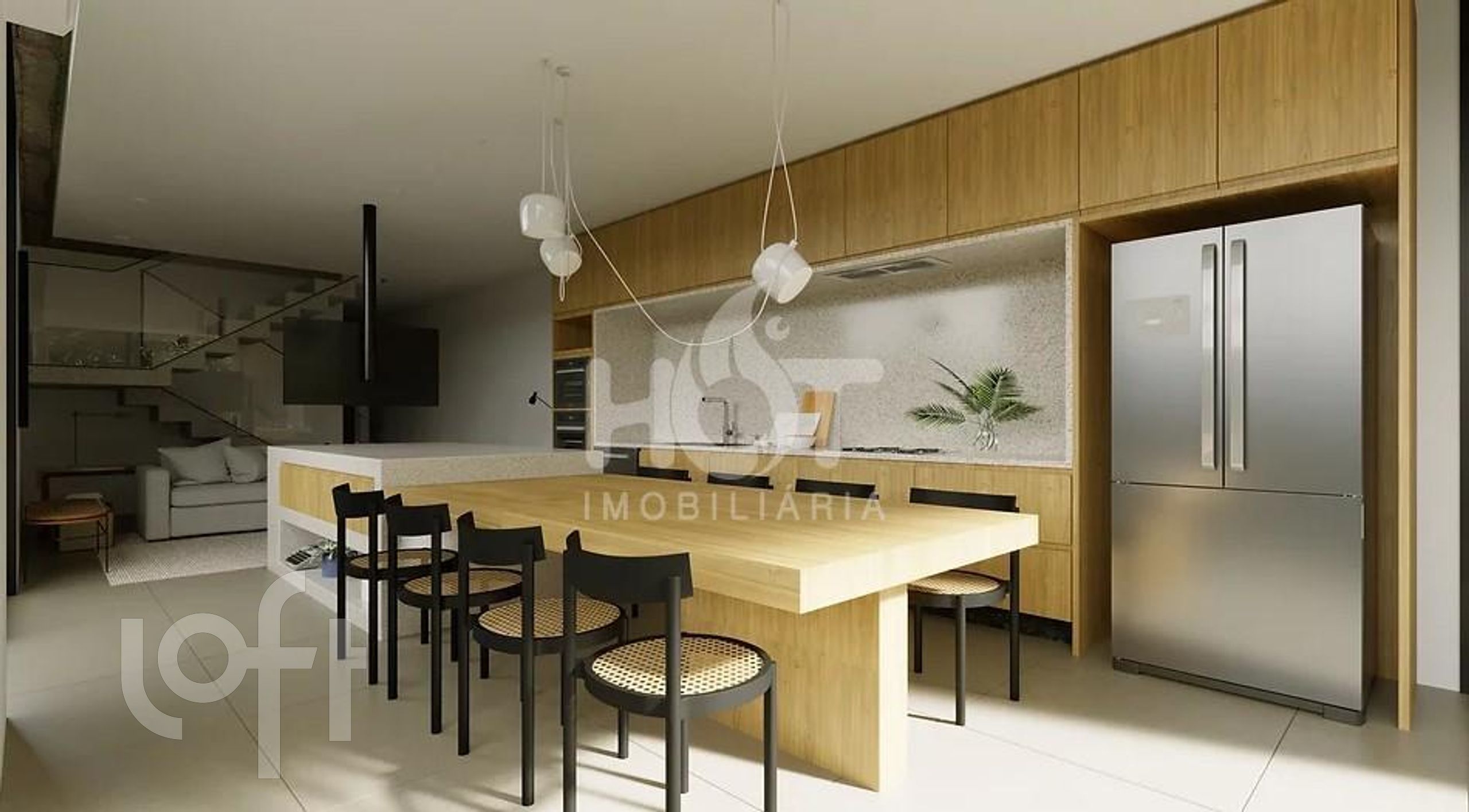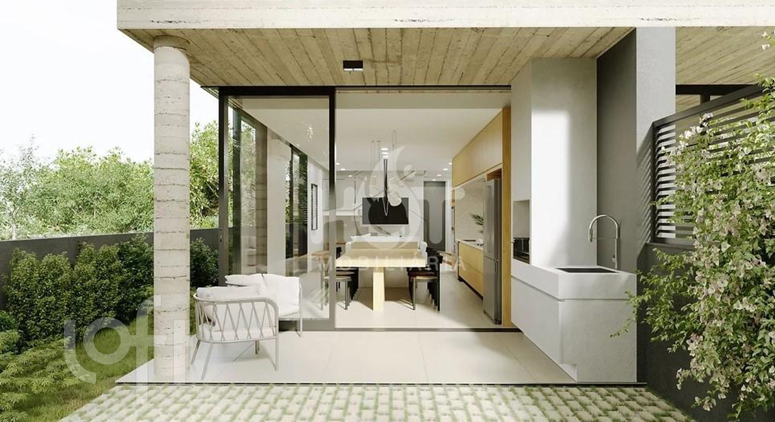 O projeto da casa foi feito pensando na integração da sua área interna e externa, de forma que os espaços se ampliem. O destaque vai para a ilha no meio da sala que serve de mesa de jantar, apoio para cozinha e também para a churrasqueira.