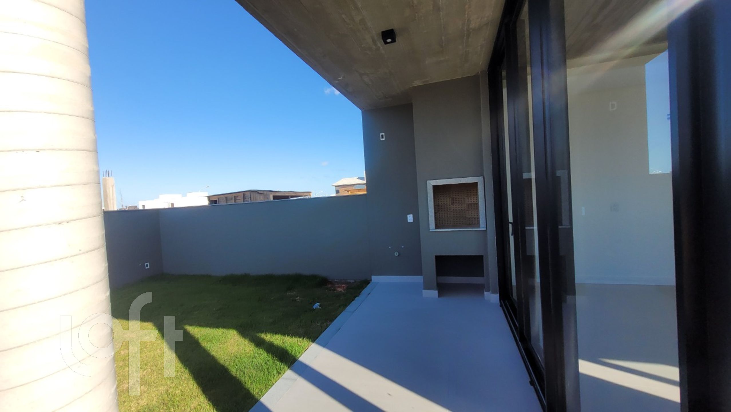O projeto da casa foi feito pensando na integração da sua área interna e externa, de forma que os espaços se ampliem. O destaque vai para a ilha no meio da sala que serve de mesa de jantar, apoio para cozinha e também para a churrasqueira.