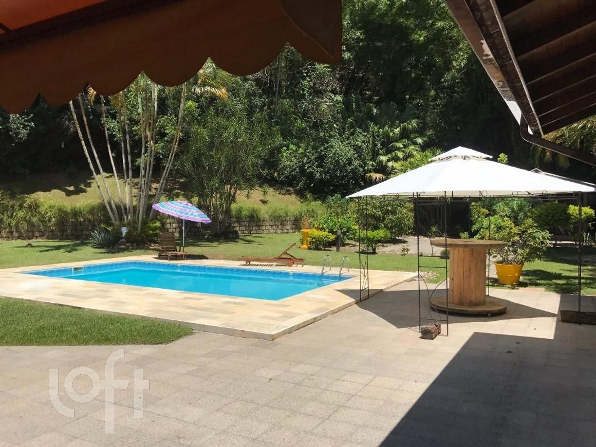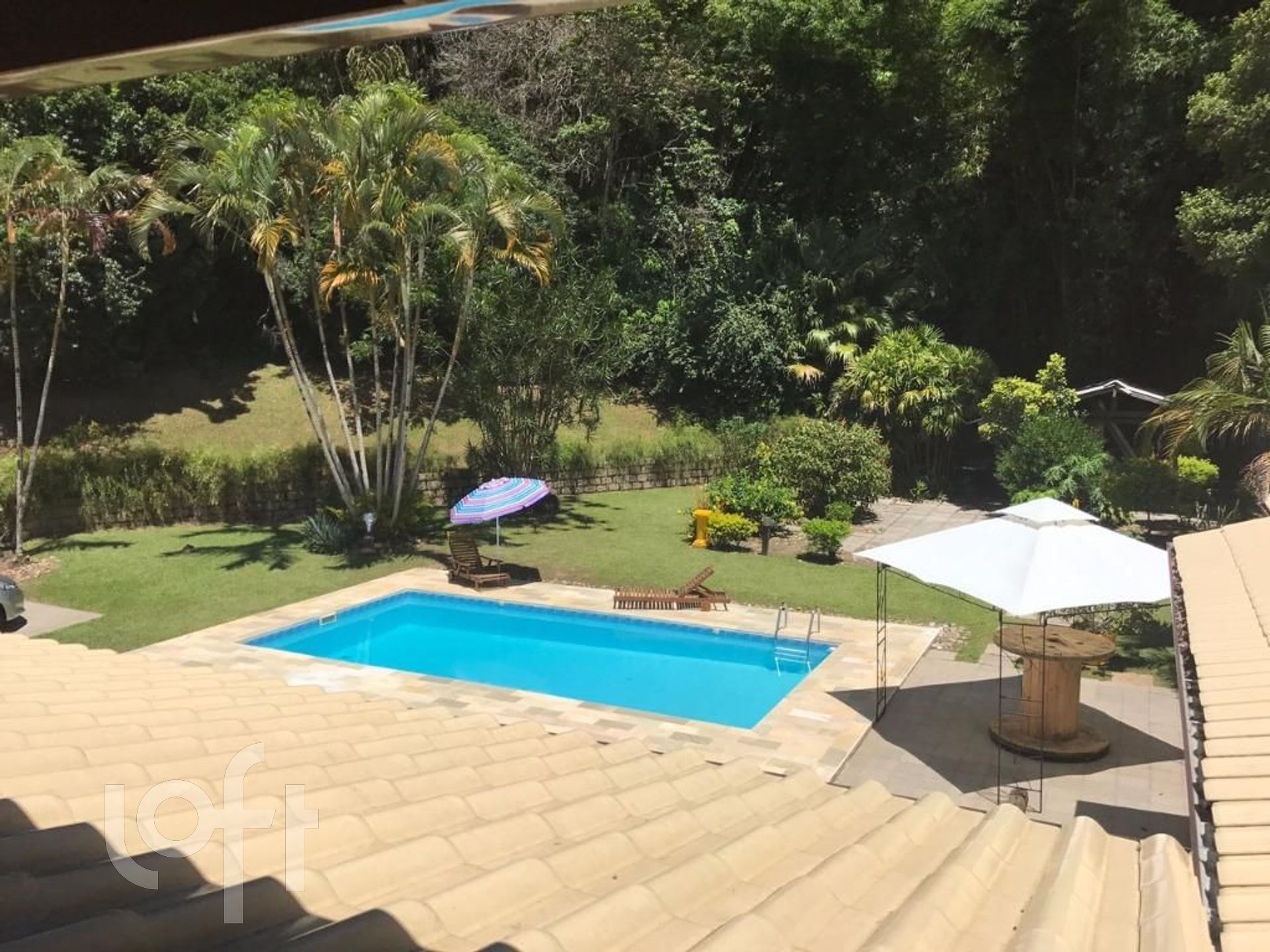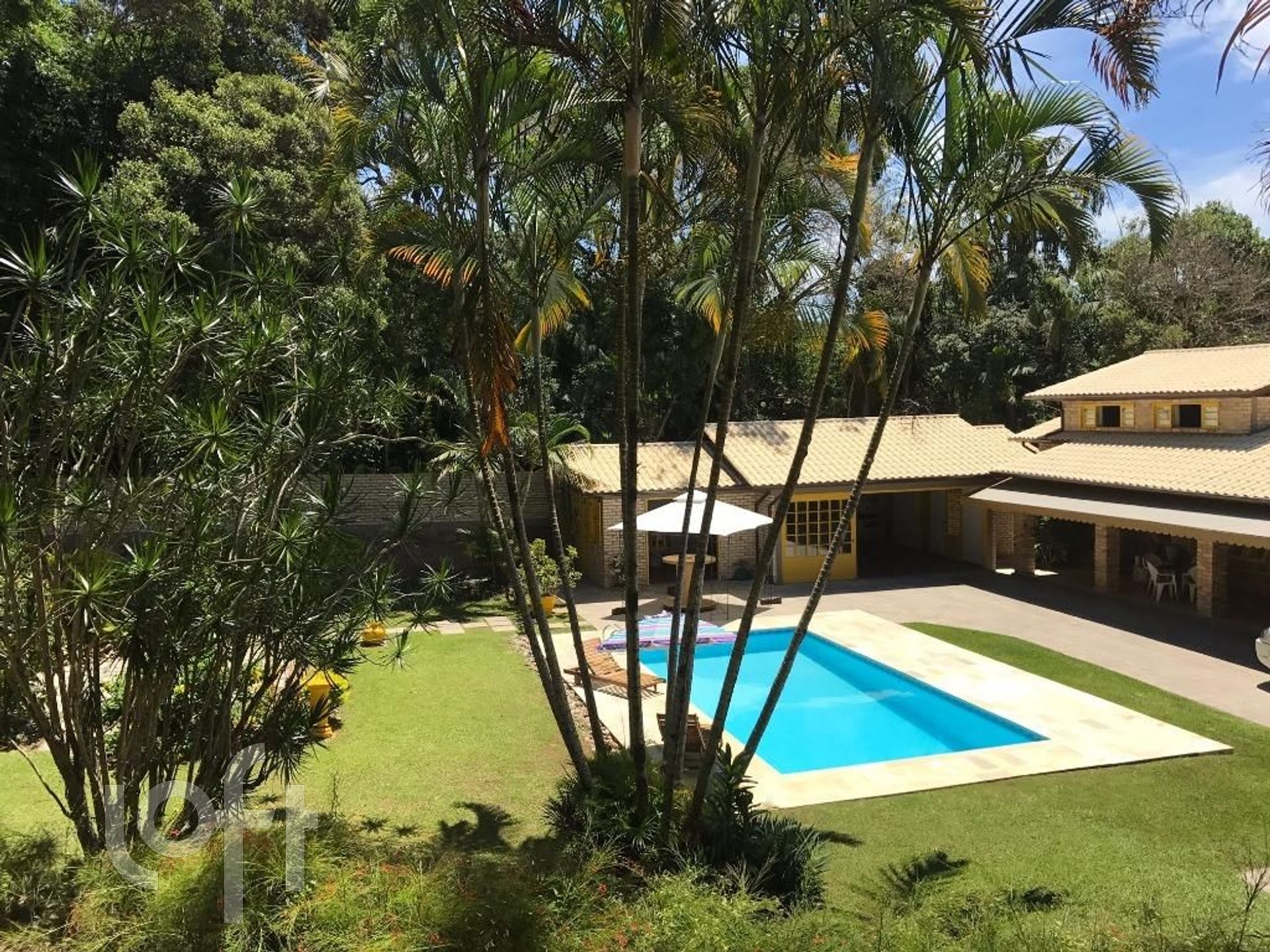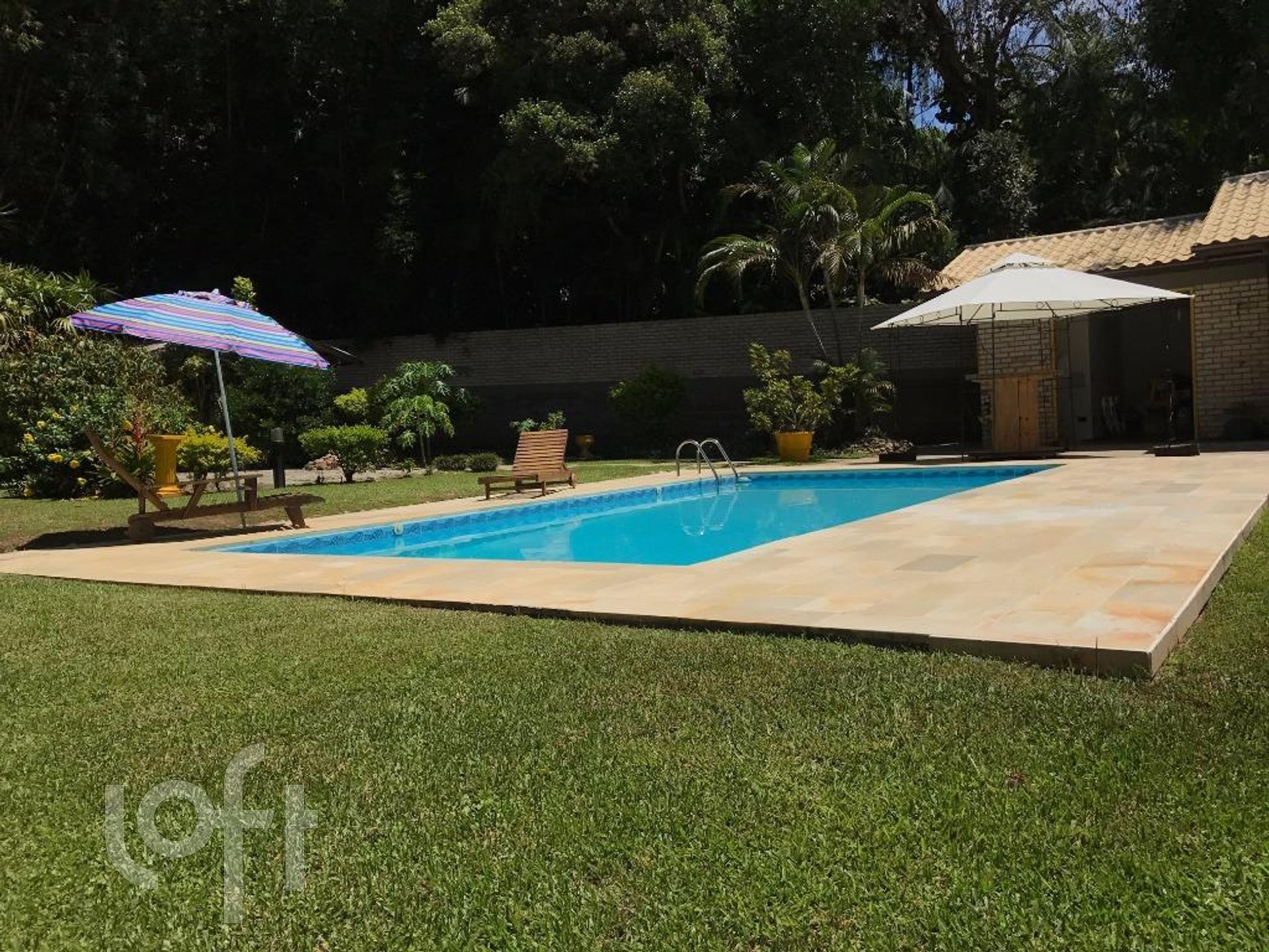 Cercado por muito verde o imenso jardim conta com uma piscina grande para curtir os dias ensolarados com a família e amigos.