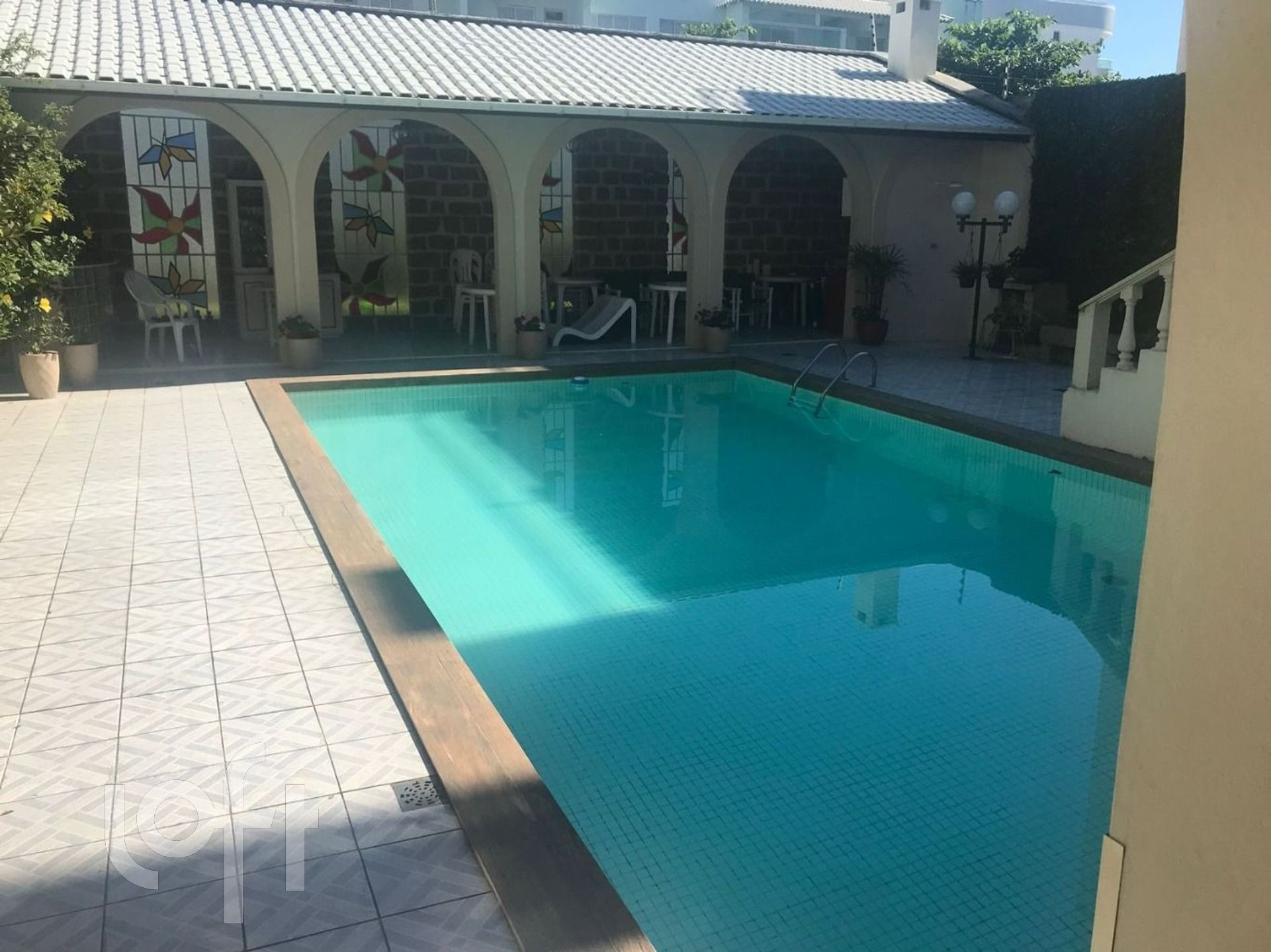 5 banheiros, 2 cozinhas, amplas salas, mezanino, pátio com churrasqueira e piscina.