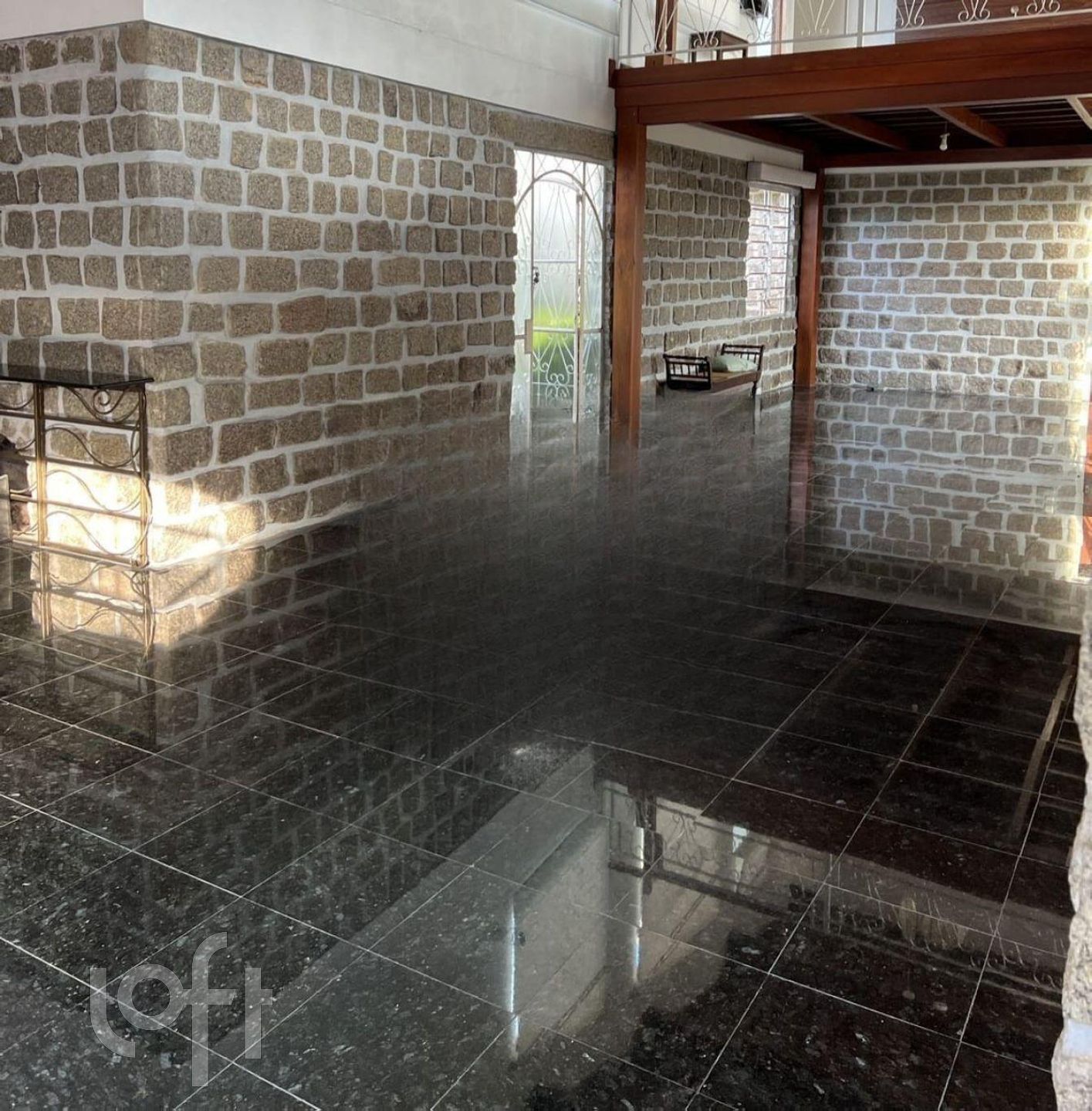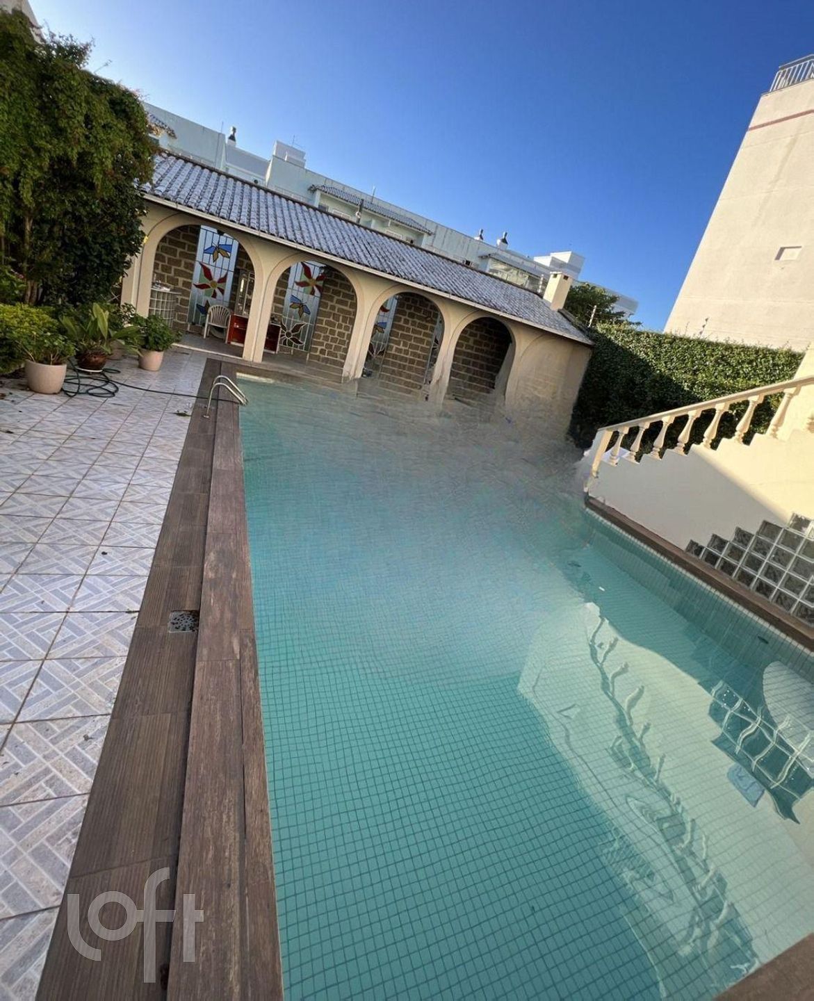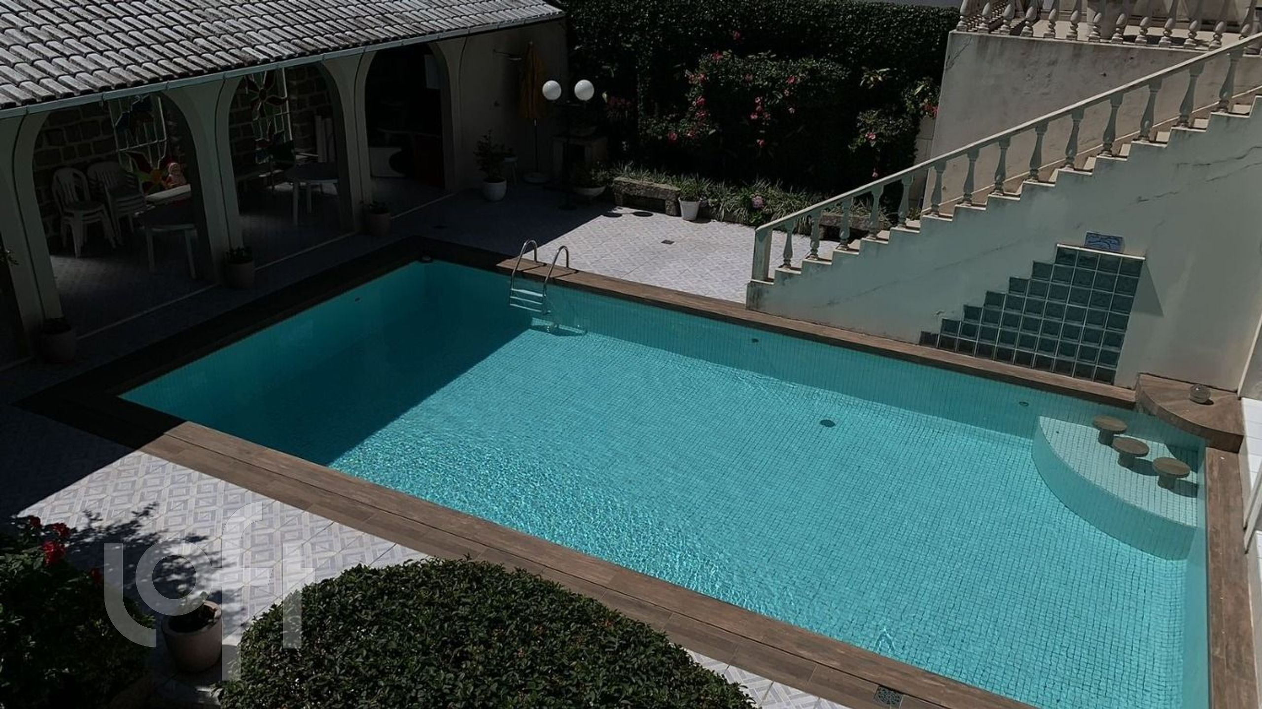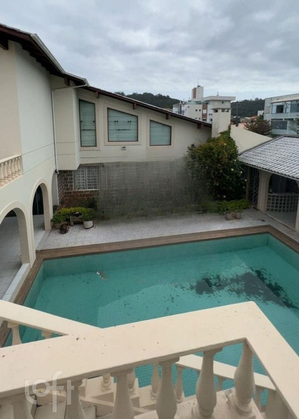 5 banheiros, 2 cozinhas, amplas salas, mezanino, pátio com churrasqueira e piscina.