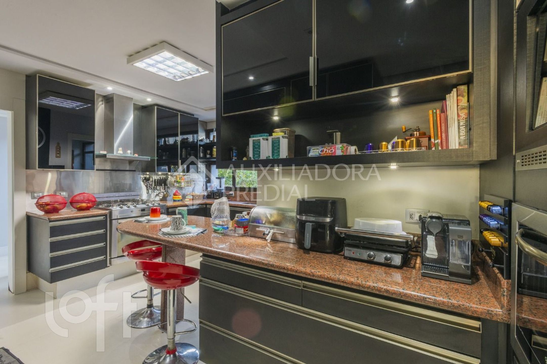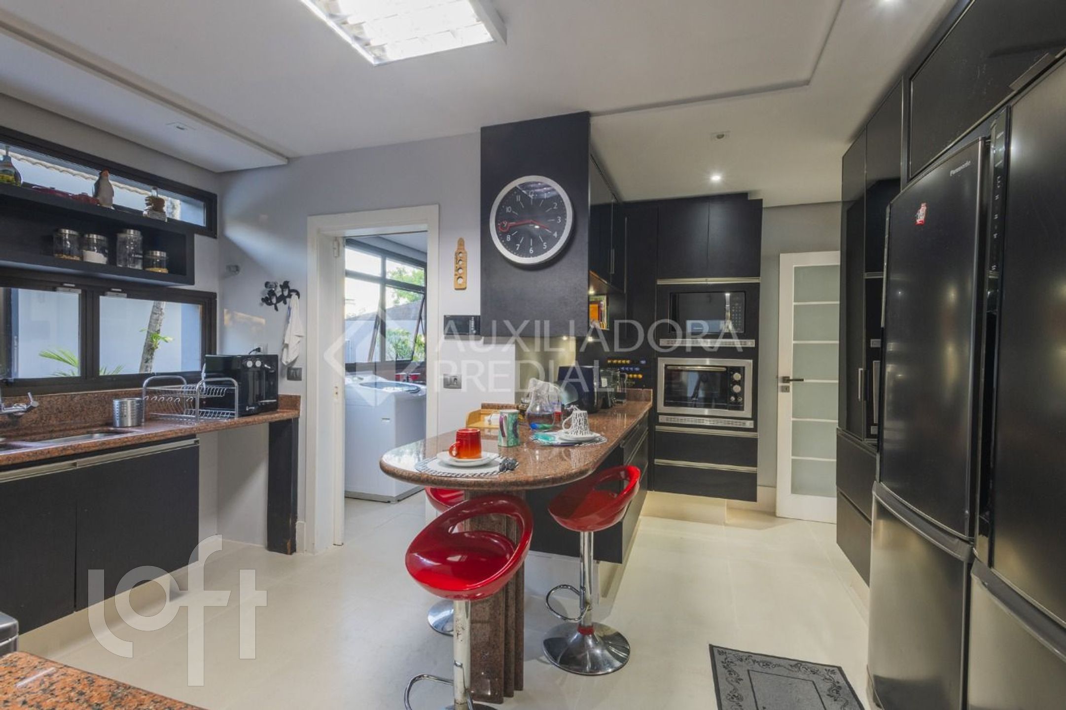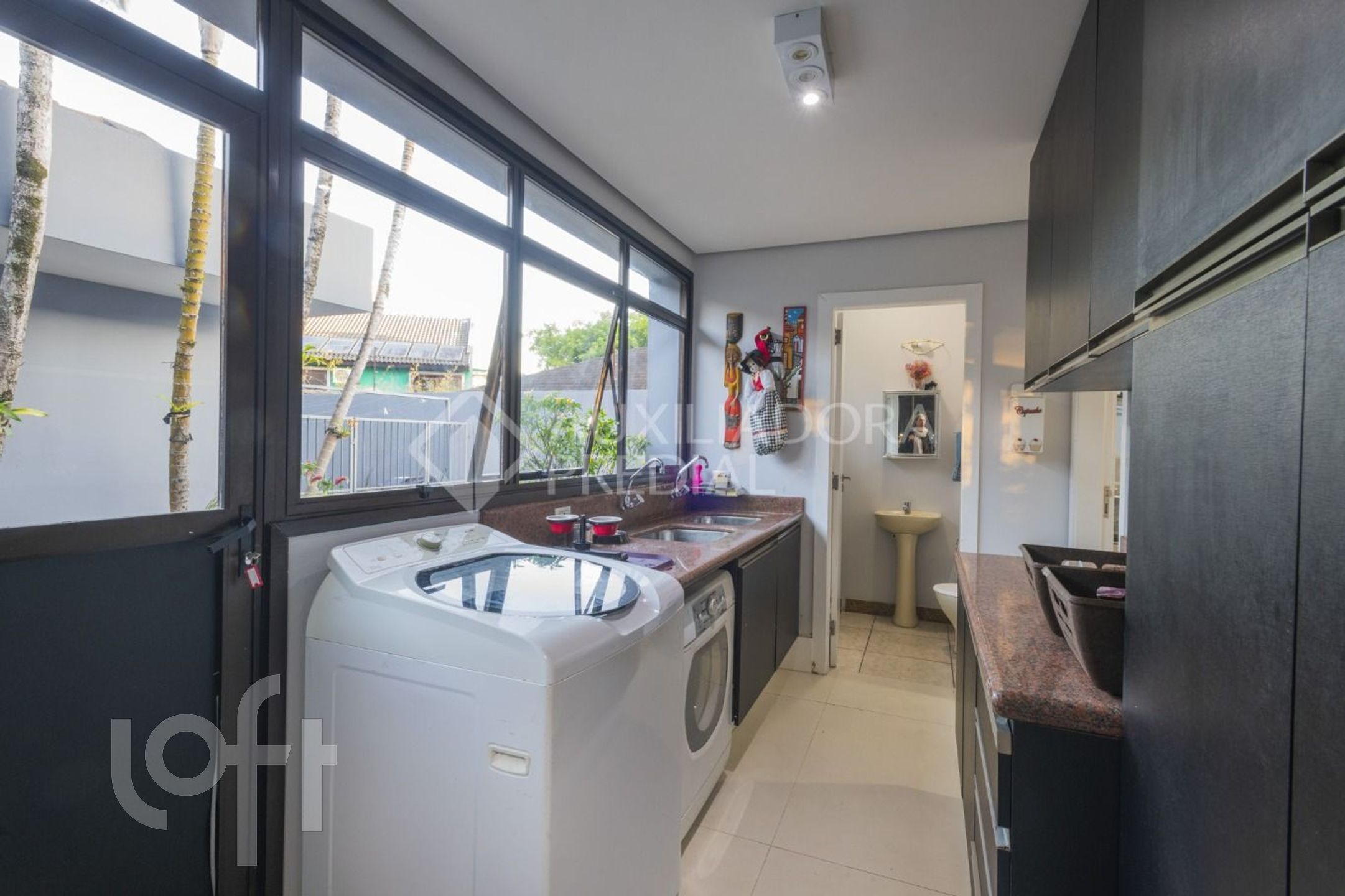 Cozinha com copa integrada e área de serviço com banheiro e dependência.