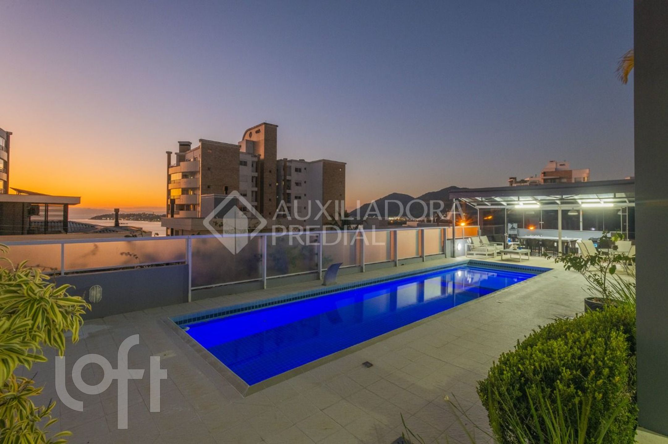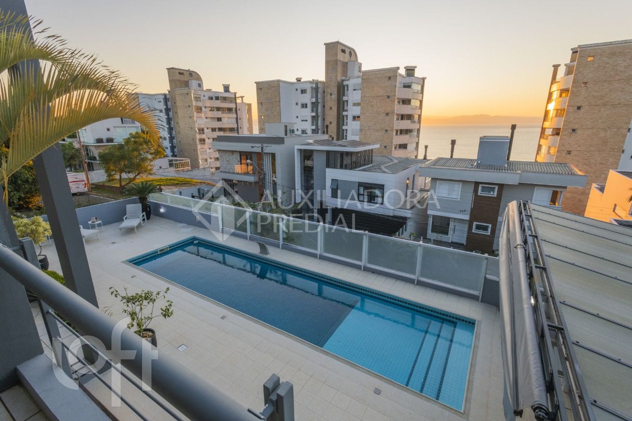 Área de lazer com piscina, espaço gourmet com churrasqueira, fogão e uma vista deslumbrante para o mar.
