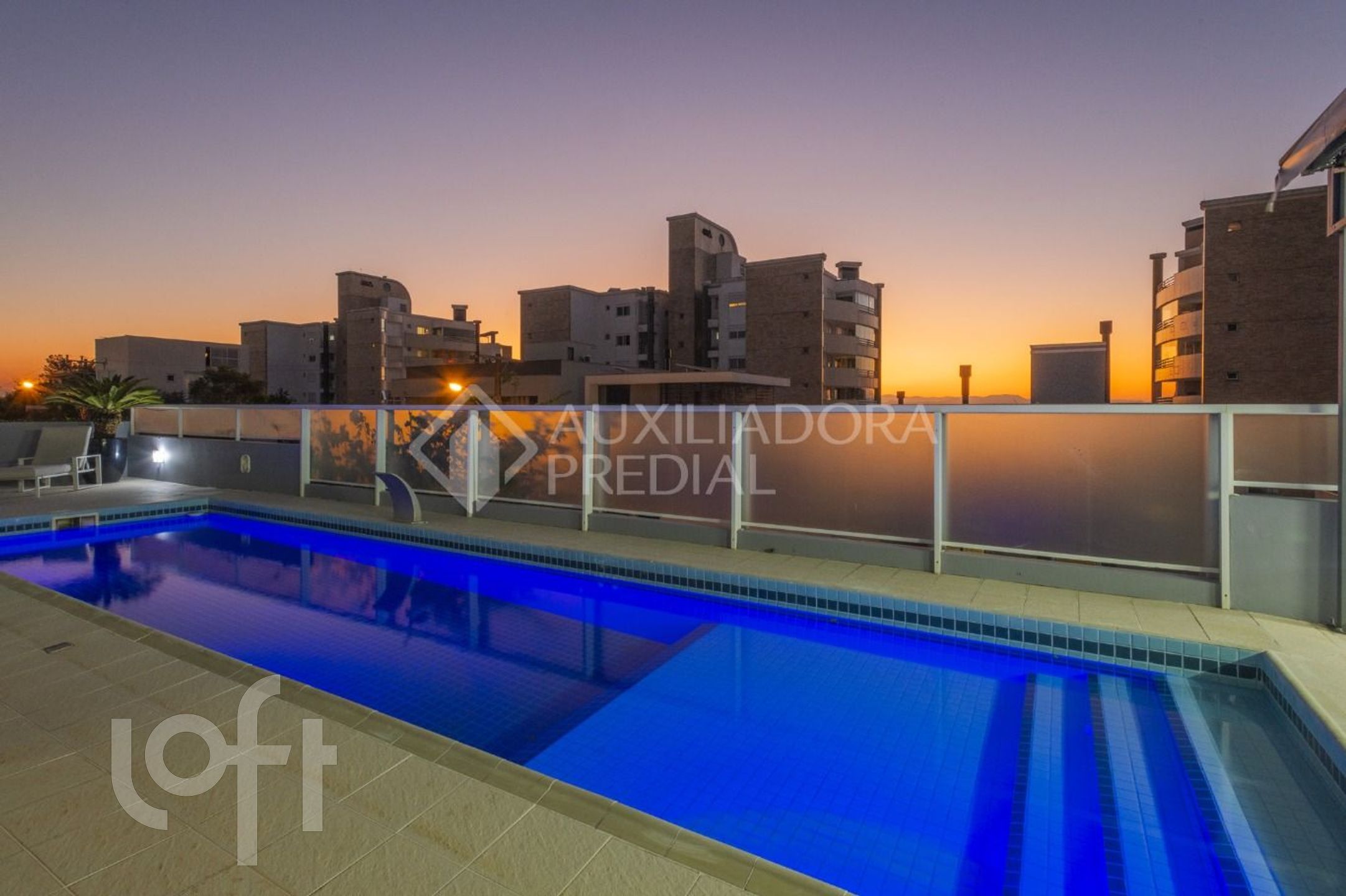 Área de lazer com piscina, espaço gourmet com churrasqueira, fogão e uma vista deslumbrante para o mar.