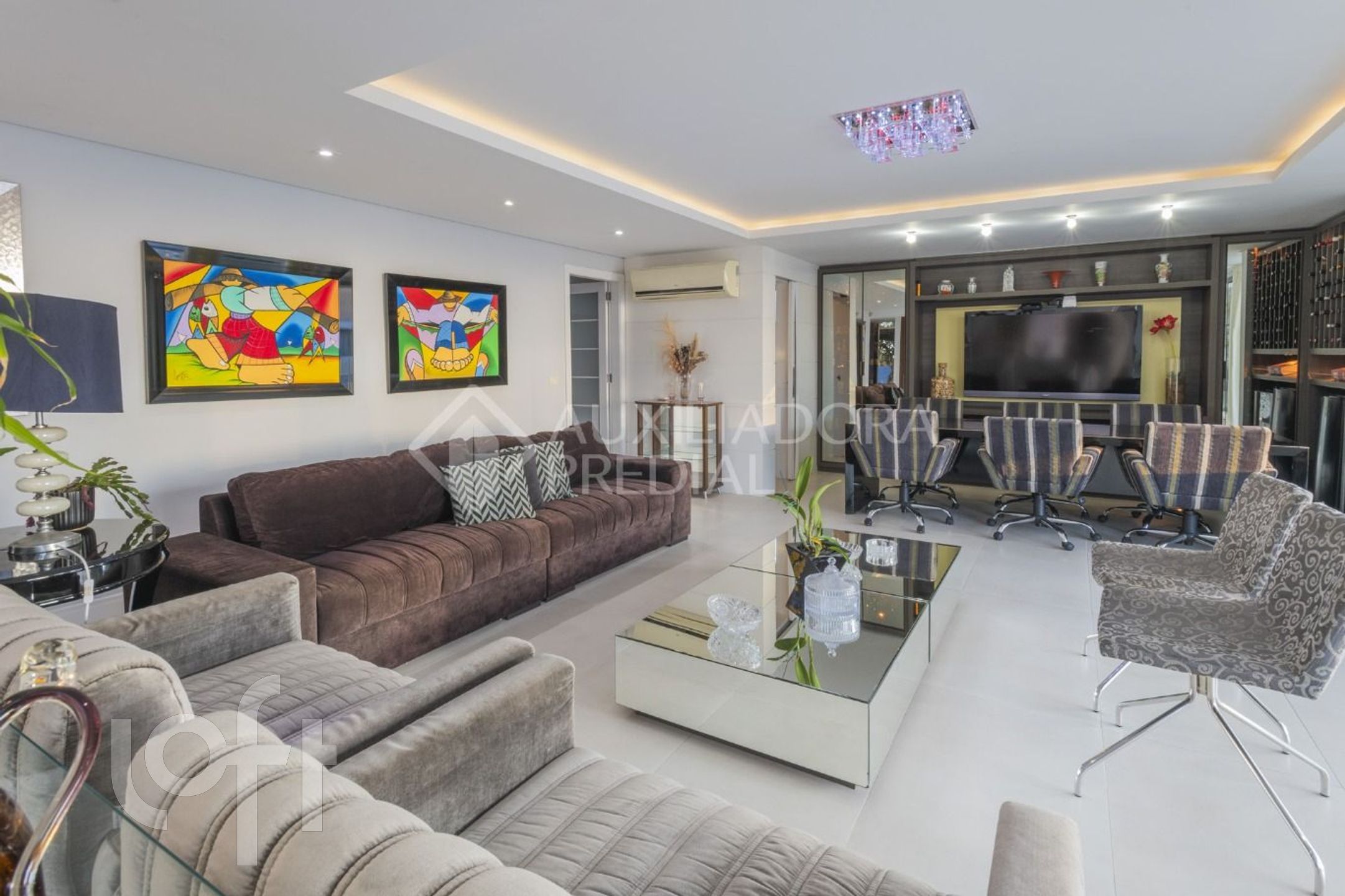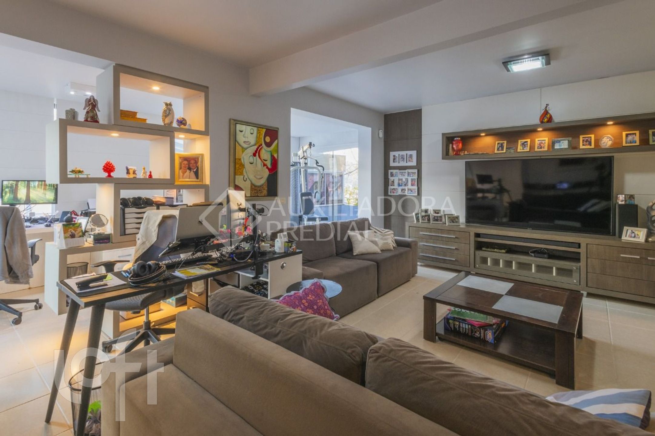 Ampla sala para 2 ambientes, sala de TV, espaço para home office e academia.
