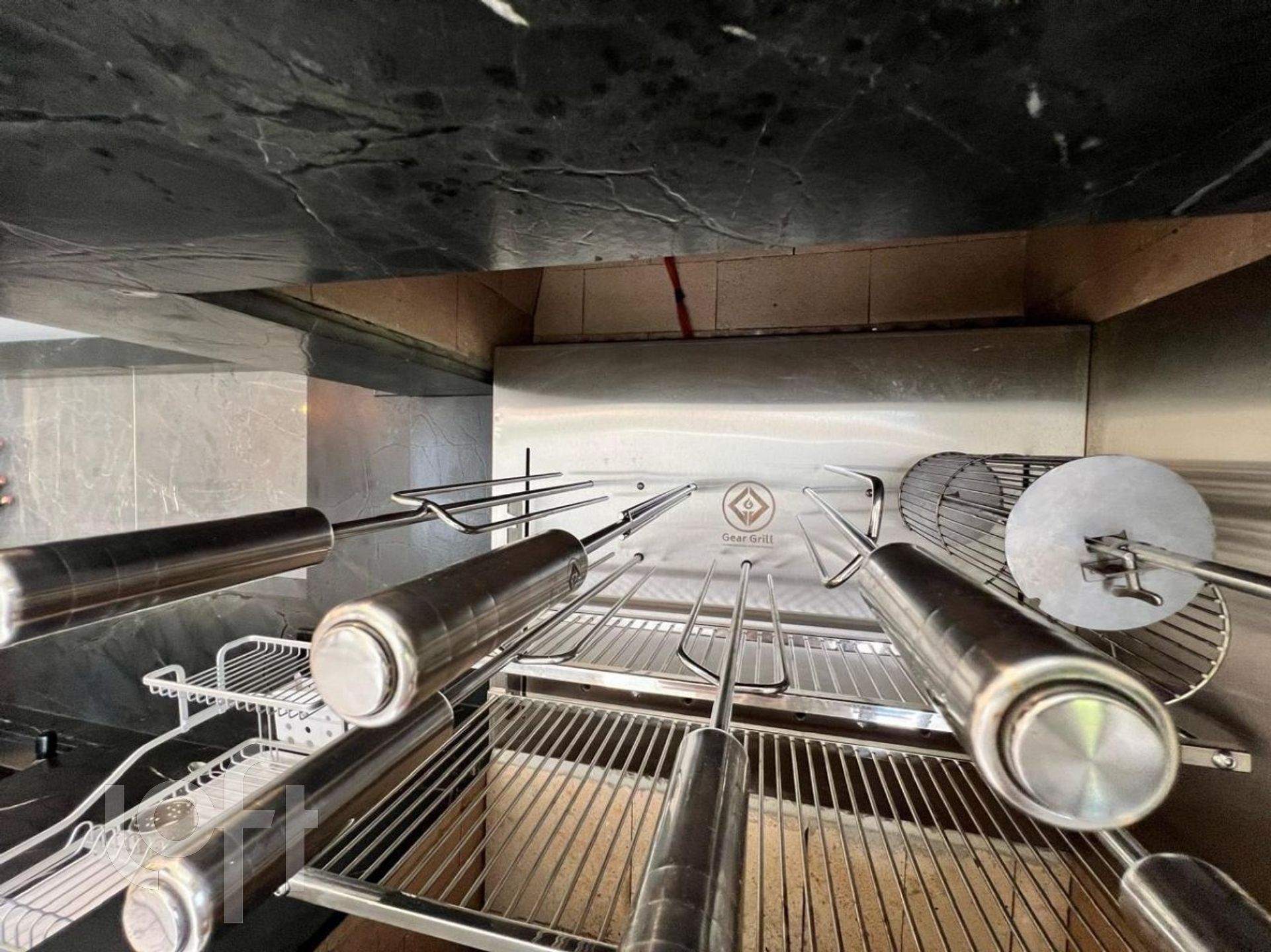 Cozinha americana com móveis planejados e churrasqueira integrada