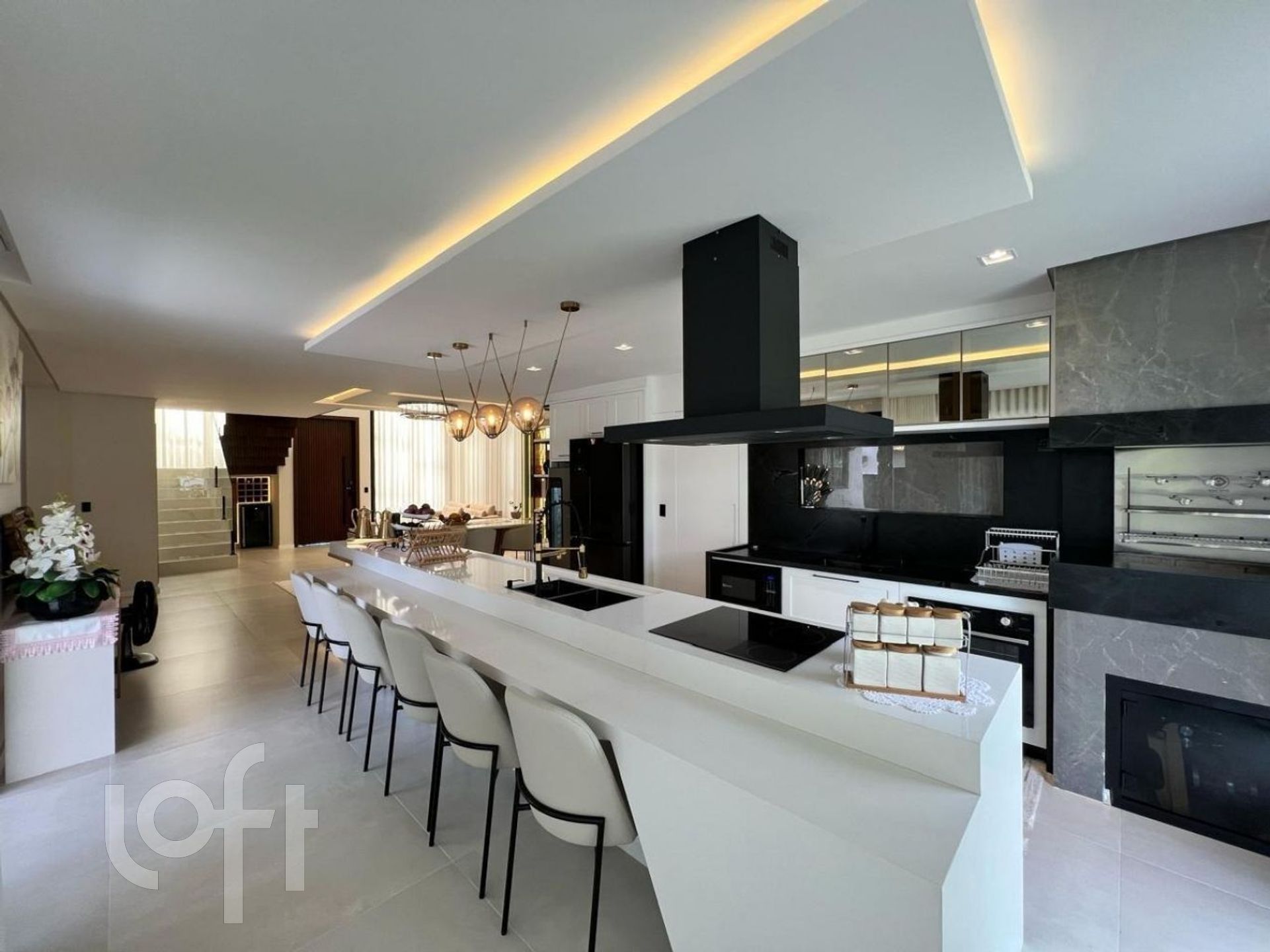 Cozinha americana com móveis planejados e churrasqueira integrada