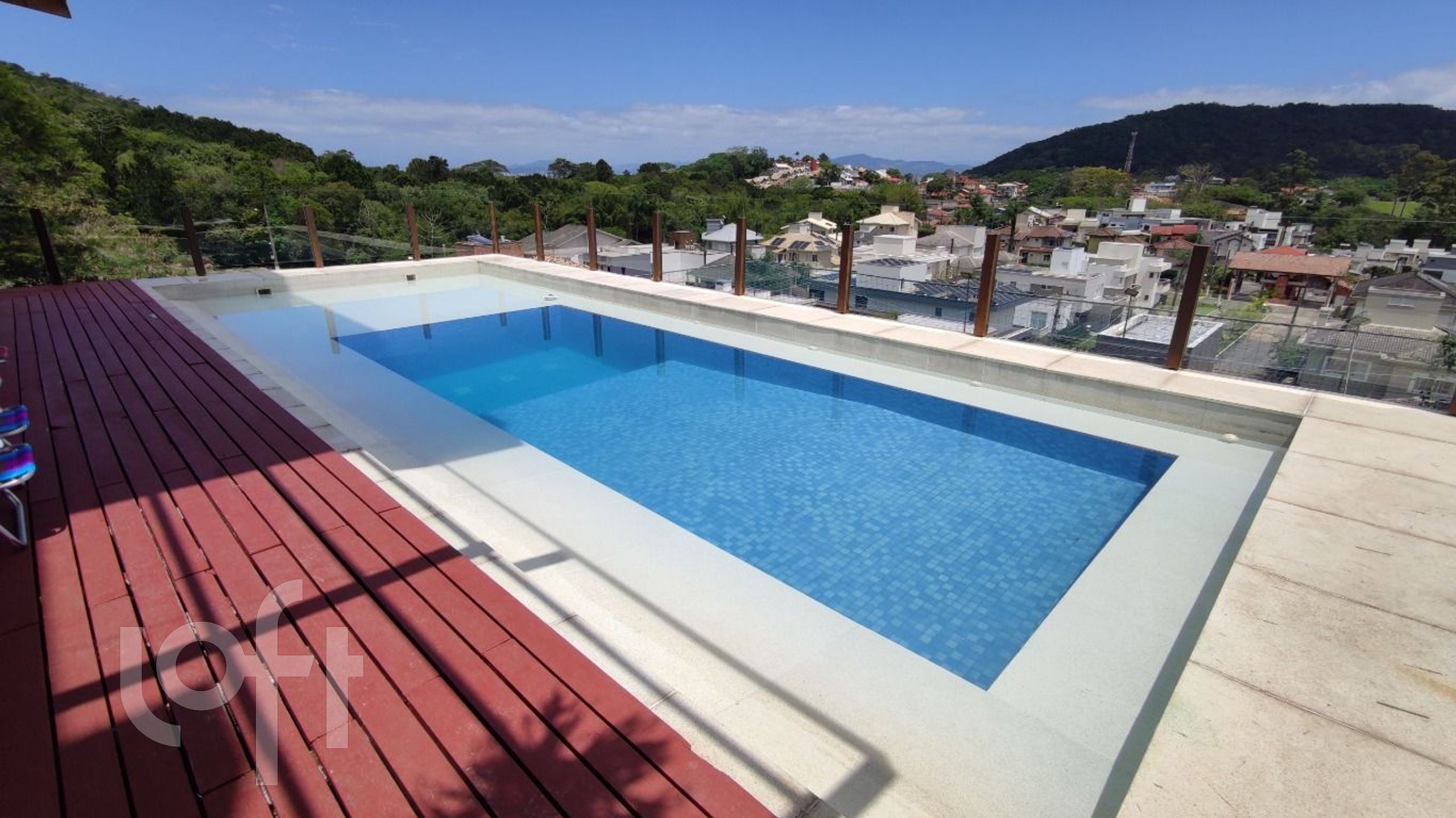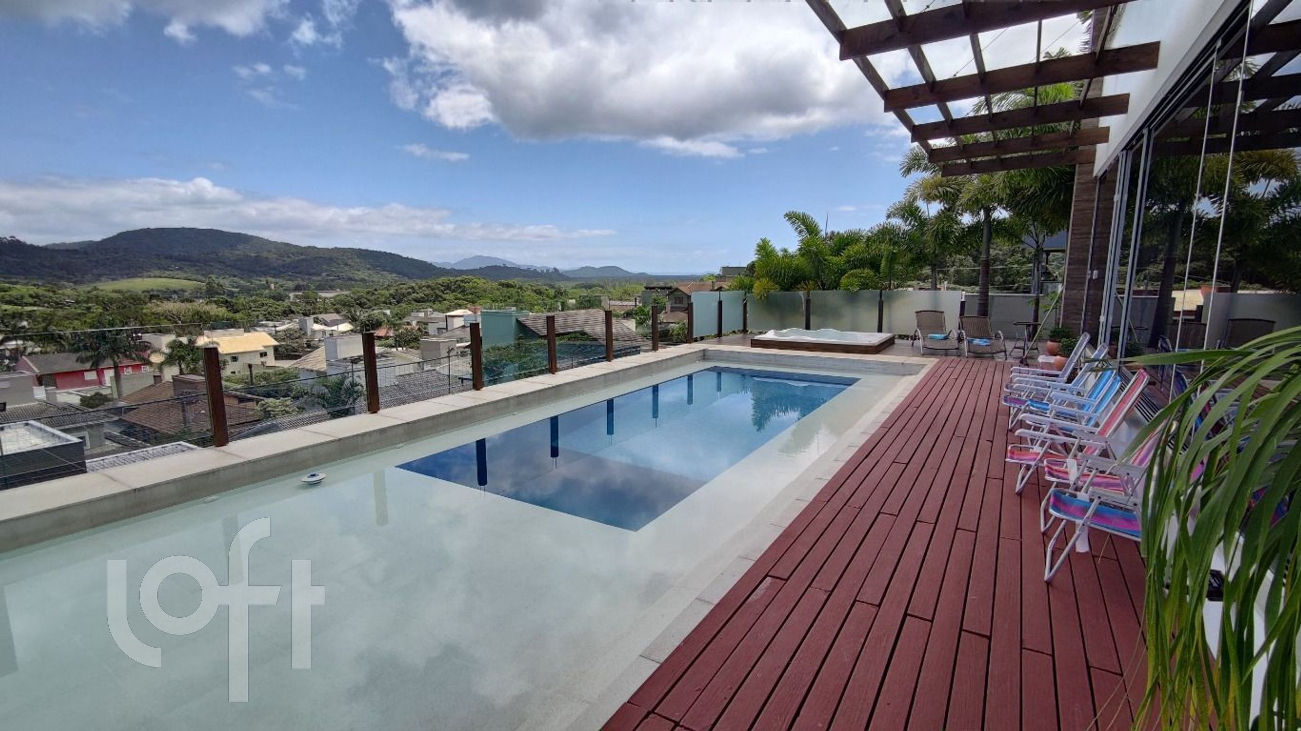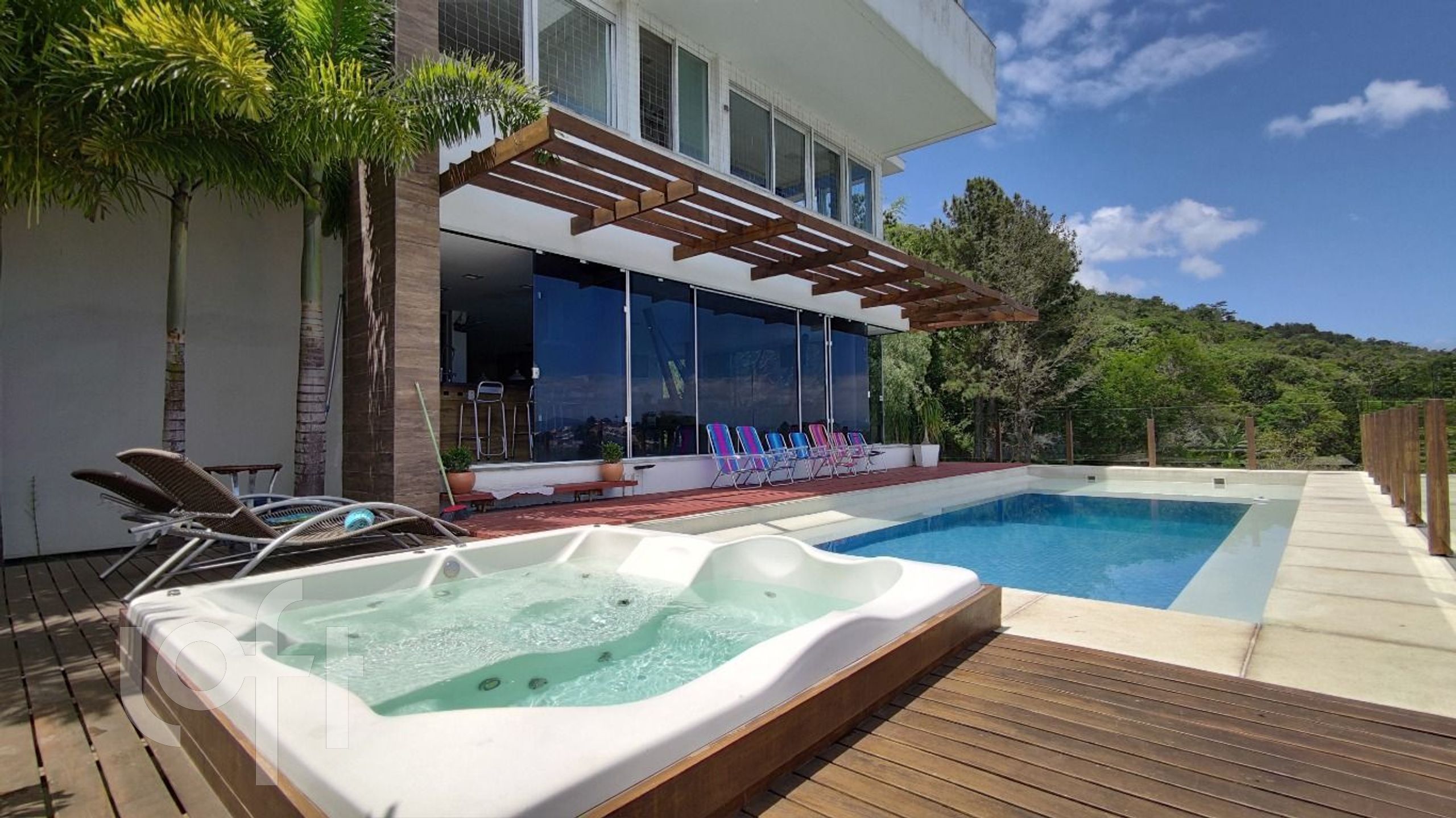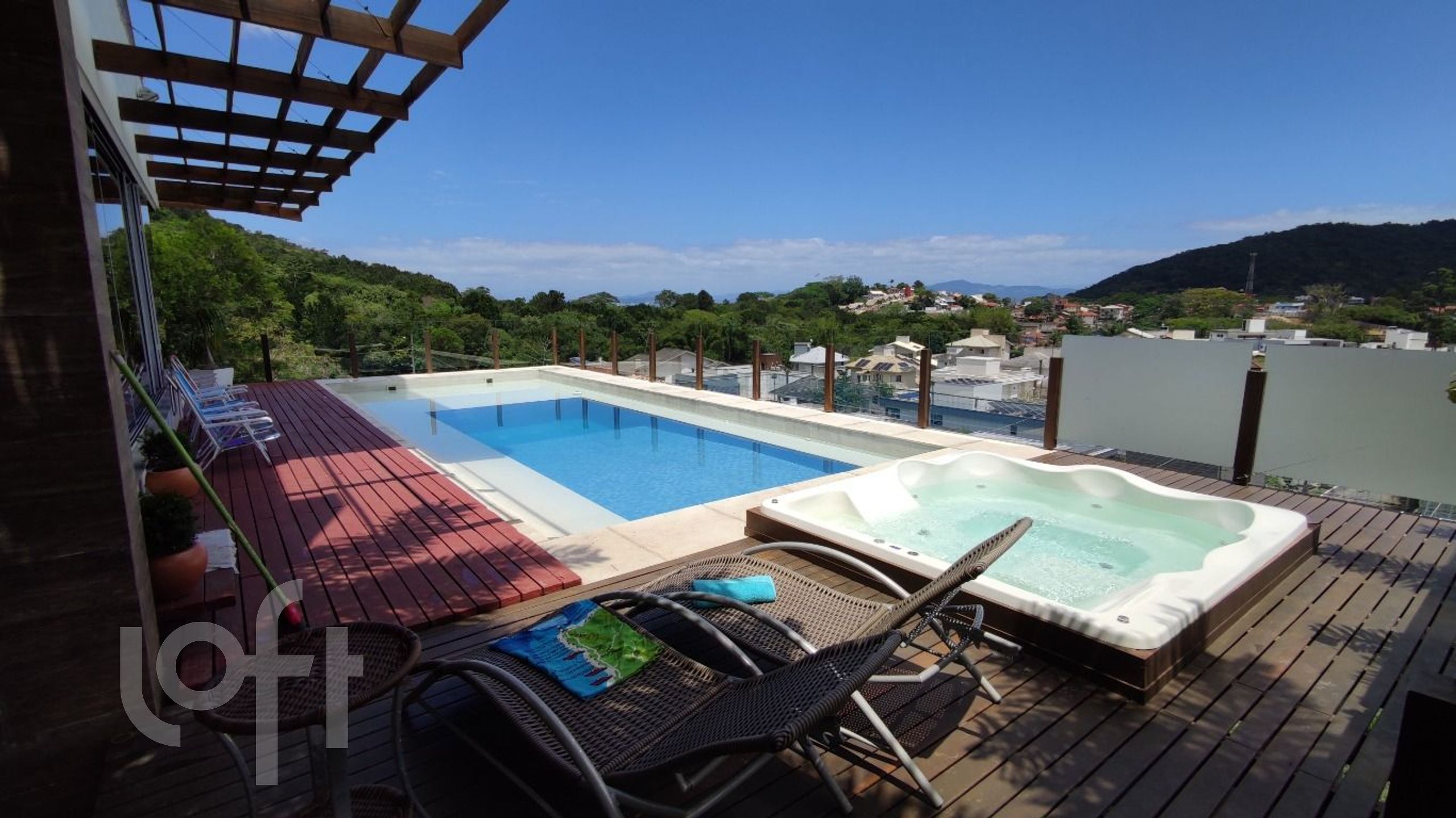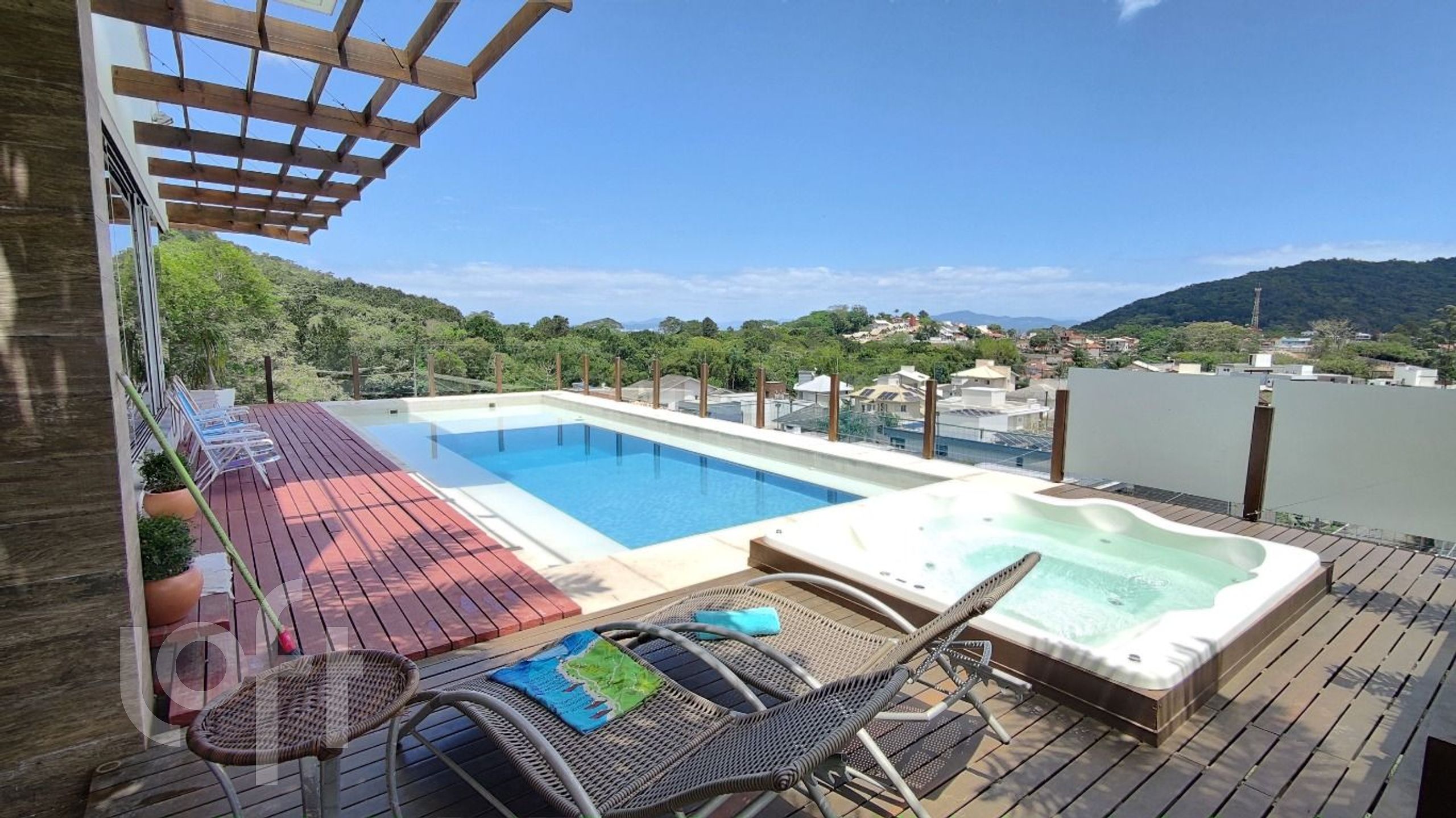 Piscina com vista infinita com 75.000 litros e iluminação interna com tratamento a sal. SPA aquecido com hidromassagem para 7 pessoas.