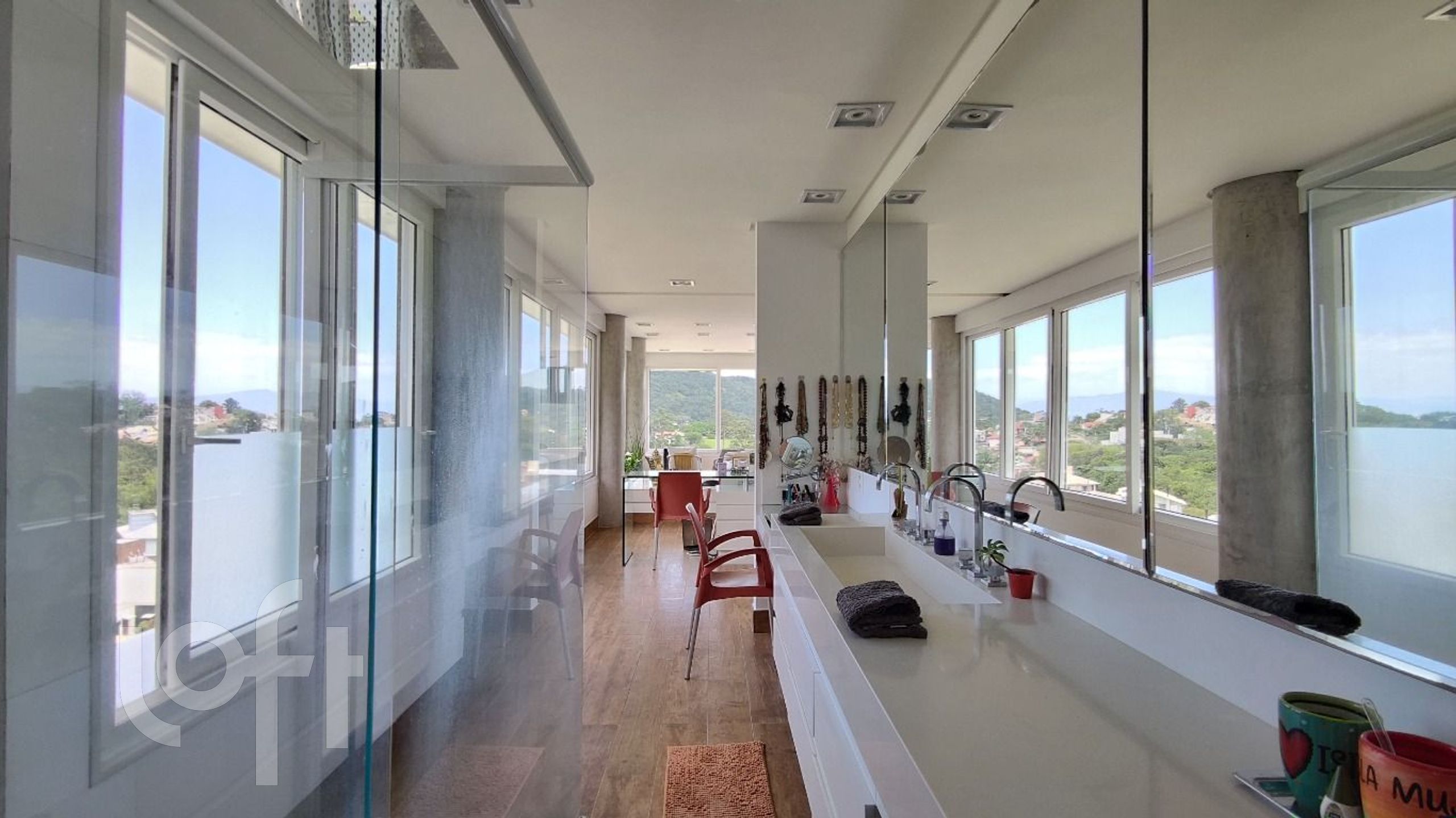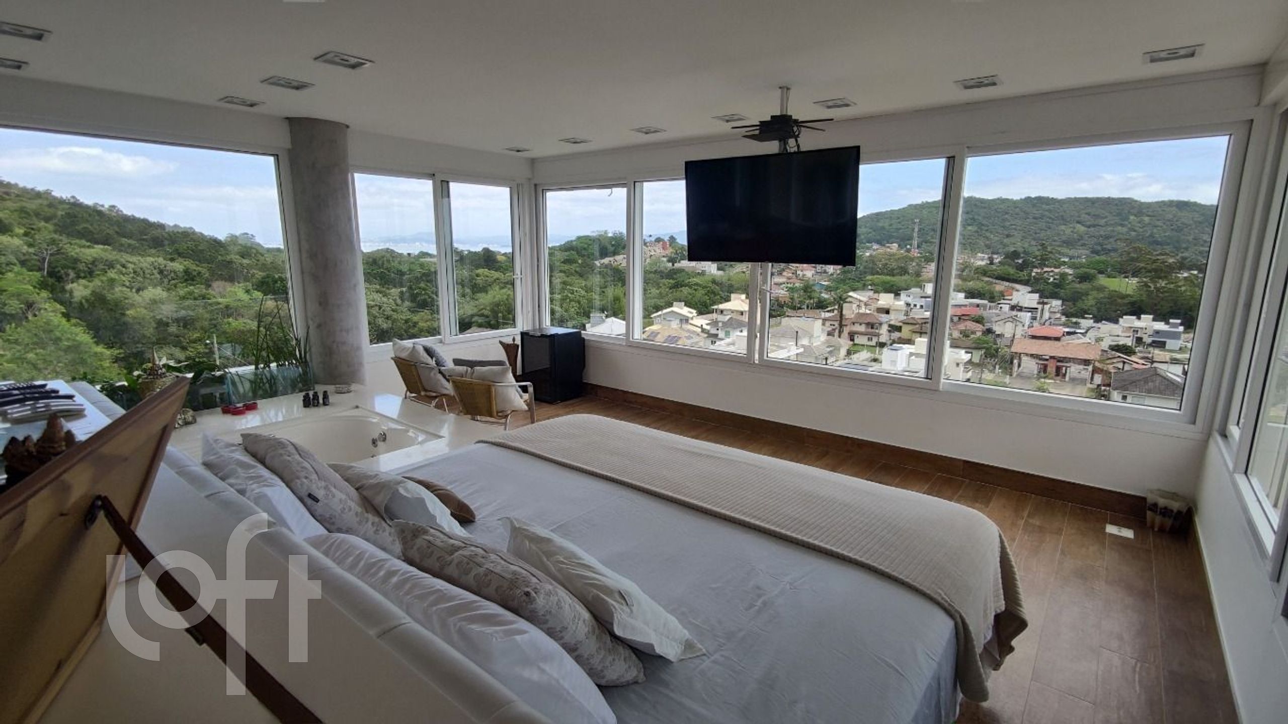 Suíte master totalmente mobilada, piso aquecido, vista mar de 270º permanente, amplas aberturas automatizadas com entrada de iluminação natural, banheira e chuveiro duplo e closet.