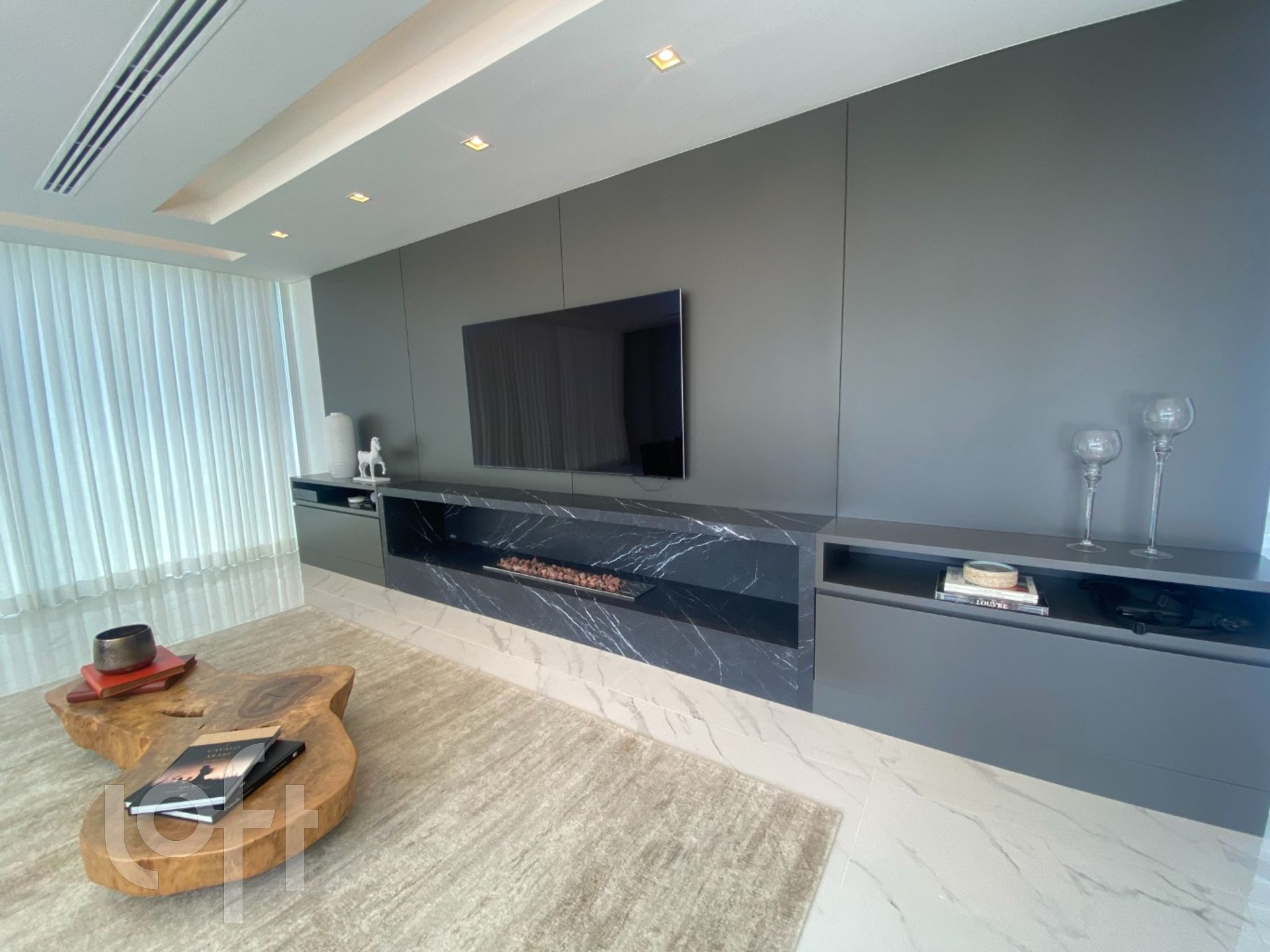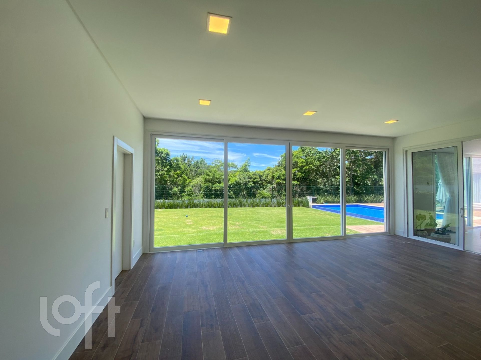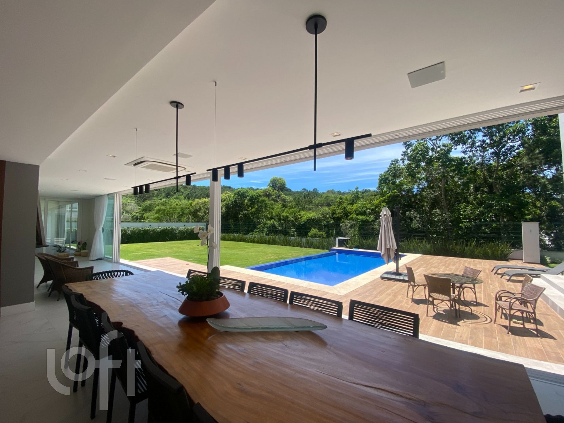 Na área externa, amplo gramado livre com uma belíssima piscina de borda infinita, aquecida e com iluminação, ducha e fogo de chão.