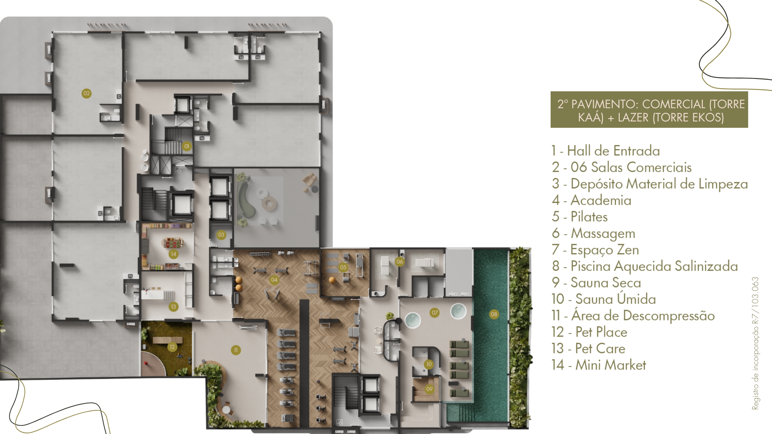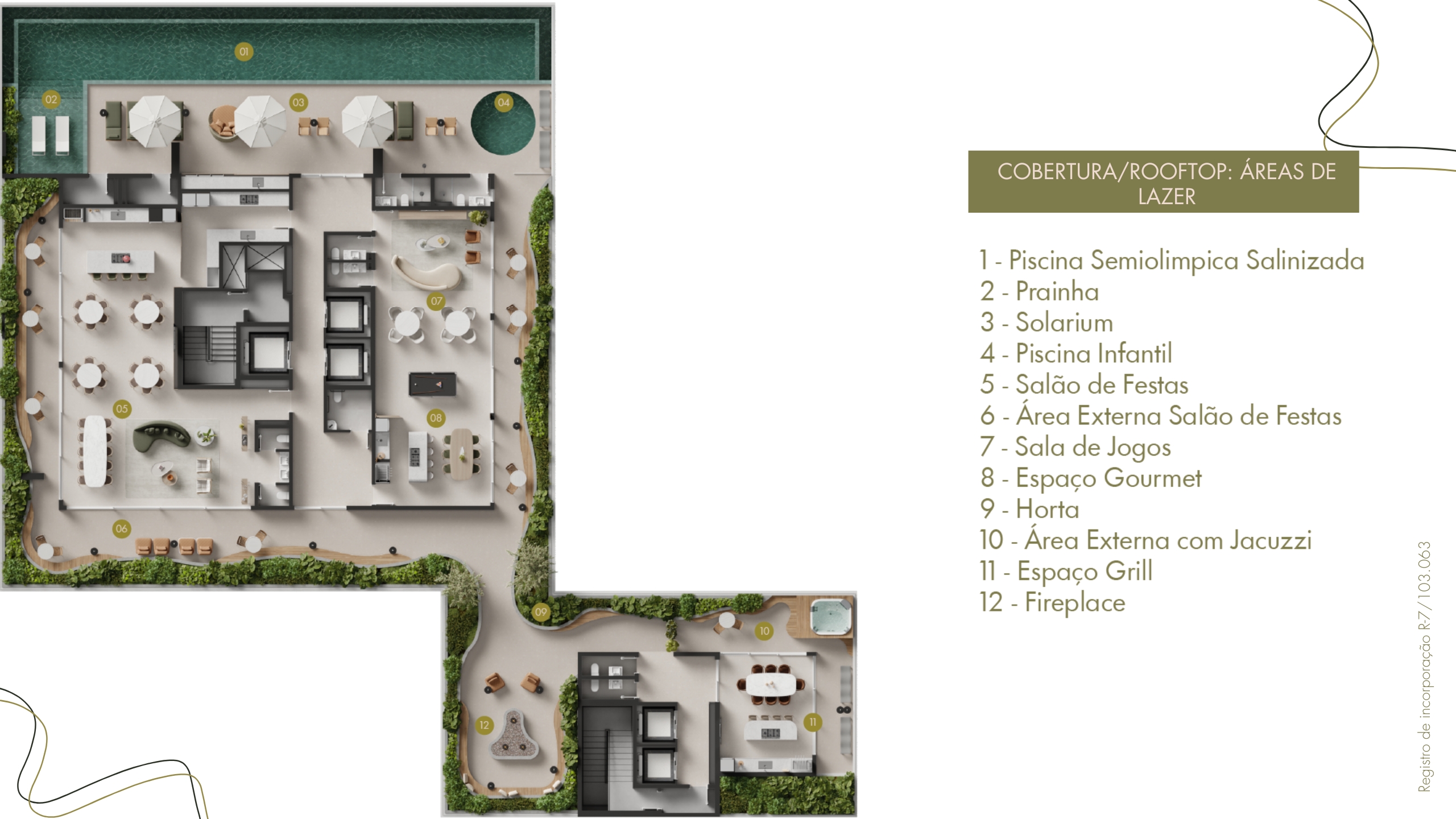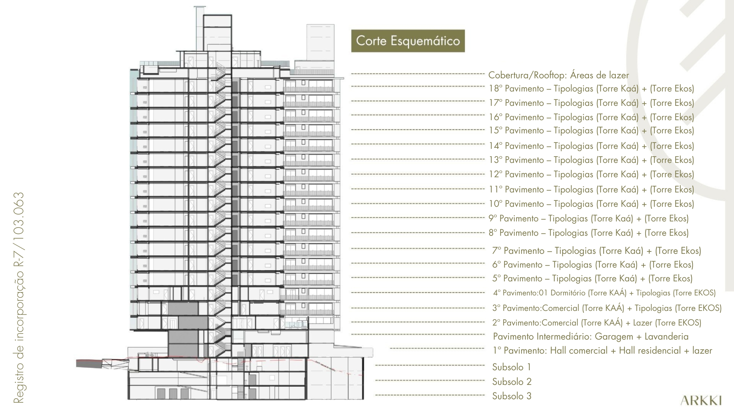 • Pavimentos: subsolos, térreo com áreas de lazer e comerciais, pavimentos tipo e rooftop