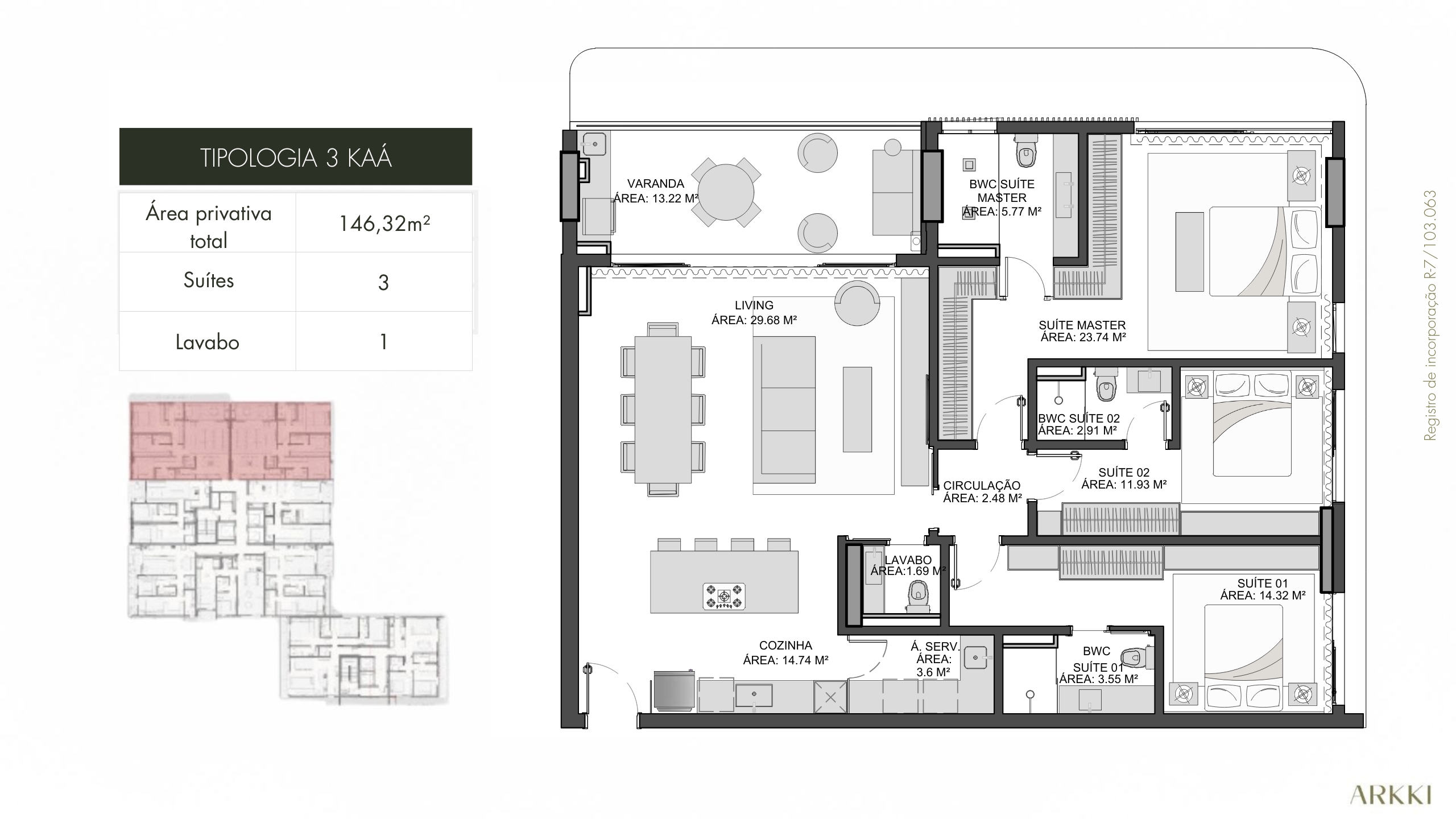 – 3 suítes e lavabo – áreas privativas de até 146 m²
